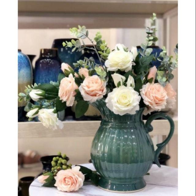 Bình hoa hồng trà hoa lụa cao cấp để bàn trang trí phòng khách, decor nhà hàng, spa, khách sạn đẹp Bình hoa hồng cao cấp thiết kế tỉ mỉ từng cánh hoa, với màu