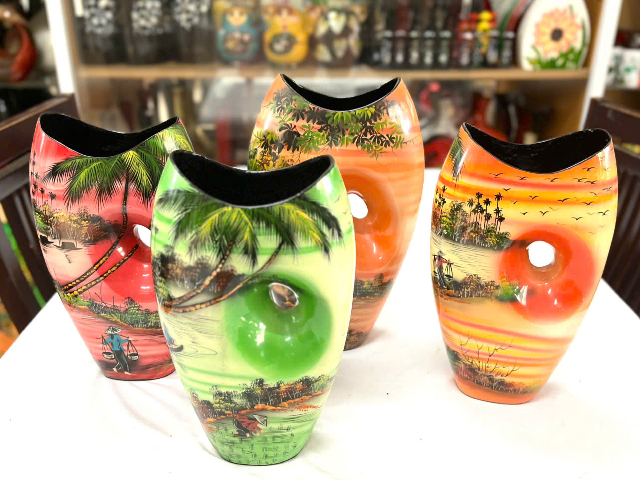 Bình miệng cá khoét lỗ là mẫu thiết kế độc đáo của thương hiệu Thanh Bình Lê, lấy cảm hứng từ hình tượng thiên nhiên cách điệu. Kiểu dáng uốn lượn mềm mại cùng lớp sơn mài bóng mịn mang lại vẻ đẹp hiện đại nhưng vẫn giữ được nét truyền thống Việt qua kỹ thuật thủ công tinh xảo.