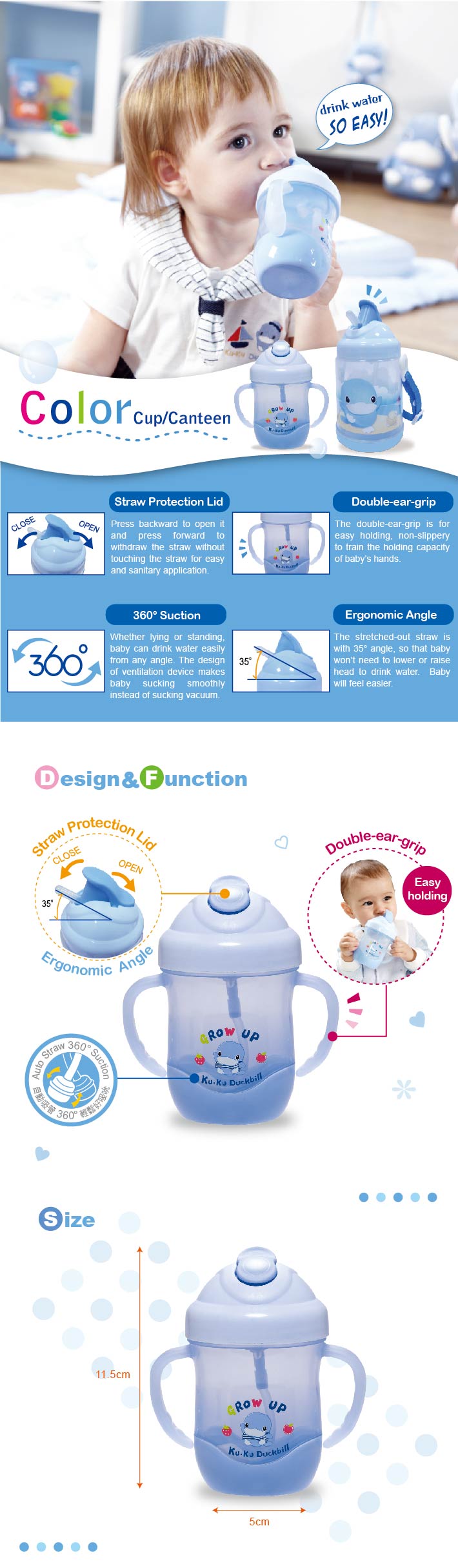 -  Chất liệu nhựa PP và silicone cao cấp, không chứa BPA, an toàn cho sức khỏe của bé; -  Thiết kế tiện dụng, ống hút sẽ bật ra ngay khi bạn nhấn, sử dụng