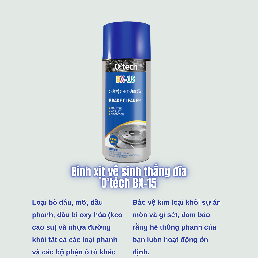 Xịt vệ sinh thắng đĩa O'tech BX-15 là lựa chọn tối ưu để chăm sóc hệ thống phanh của bạn. Với công thức độc đáo, sản phẩm này được sản xuất đặc biệt để loại
