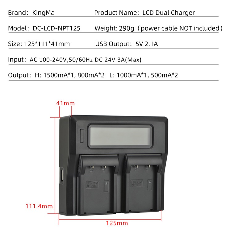 Bộ 1 pin 1 sạc máy ảnh Kingma cho Fujifilm NP-T125 Thông tin sản phẩm: Pin Kingma for Fujifilm NP-T125: -Model:NP-T125; -Điện áp 10.8V; -Công suất: 1200mAh 13Wh; -Loại pin: Pin Li-ion; -Kích thước: 53 35 26mm; -Khối lượng tịnh: 85g; -Pin lithium-ion có thể sạc lại cho Fujifilm NP-T125 -Các tế bào cao cấp A giúp tuổi thọ pin lâu hơn mà không ảnh hưởng đến bộ nhớ -Tương thích với máy ảnh Fuji và bộ sạc Fuji - Tương thích:với FujiFilm GFX50S , GFX50R…… Sạc đôi KingMa cho NP-T125: