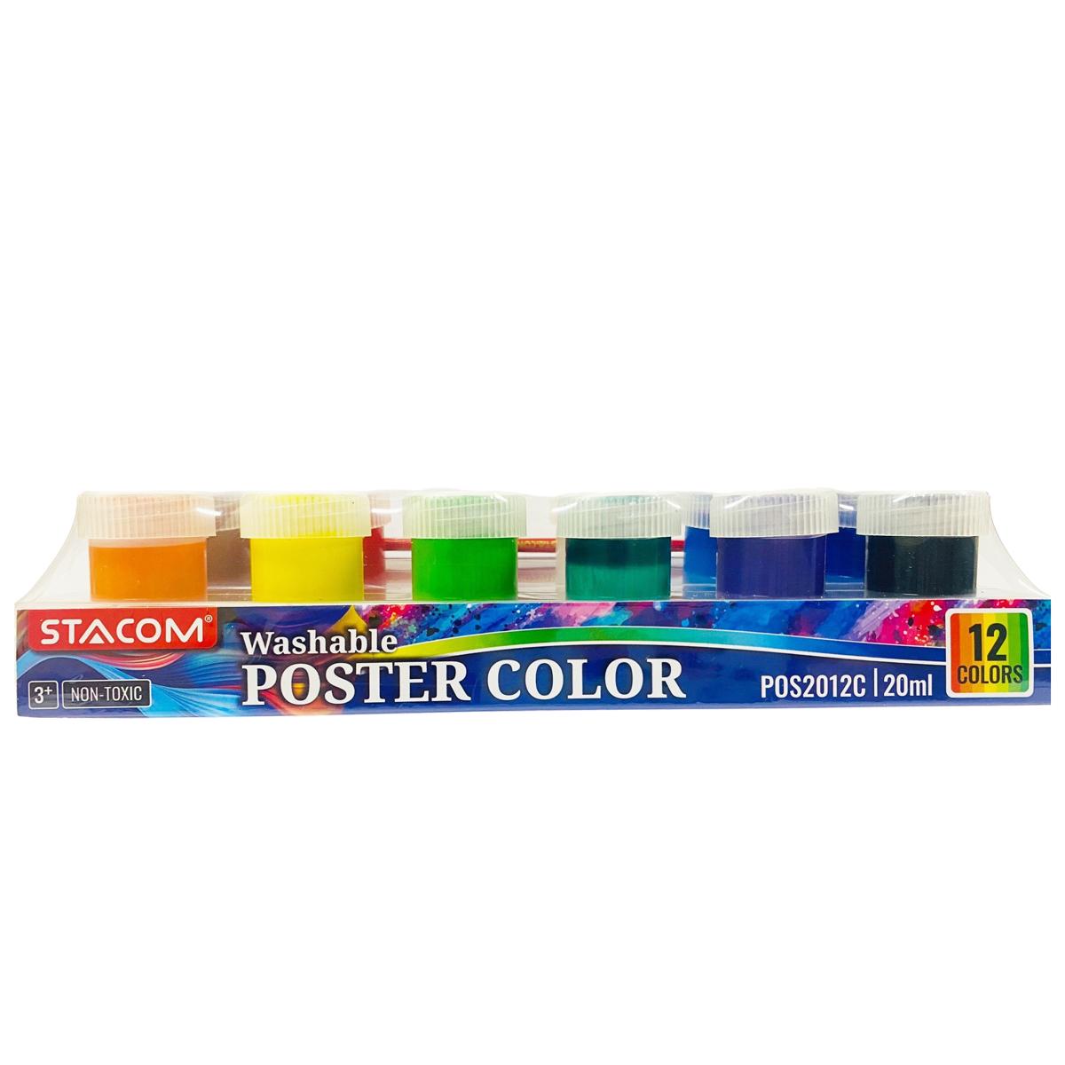 Bộ 12 Màu Nước 20 ml Kèm Cọ Vẽ - Stacom POS2012C - Bộ Màu Poster Stacom chất liệu cao cấp nhanh khô, độ bám dính tốt, độ bền màu cao cho độ sánh và