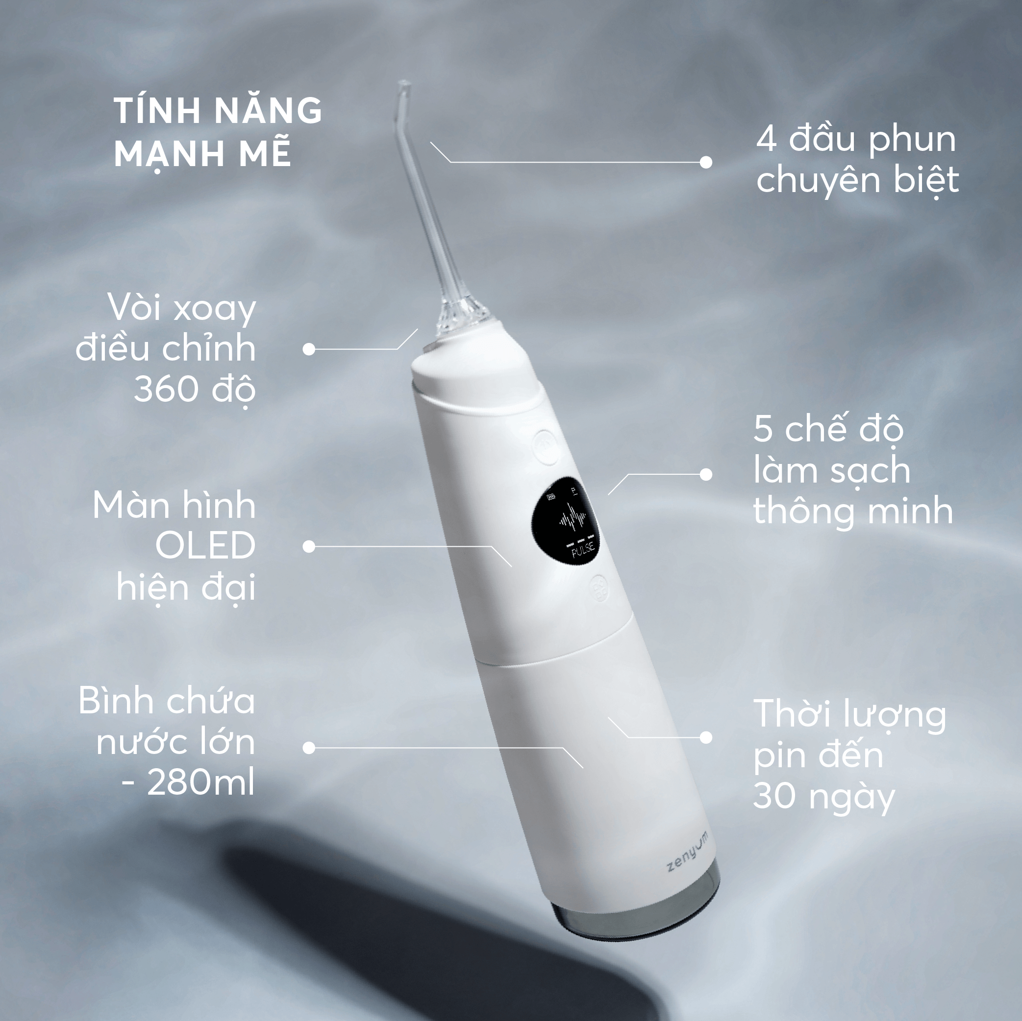 Sử dụng công nghệ xung động nước tần số cao, tăm nước Zenyum Pro giúp làm sạch thức ăn, mảng bám trong kẽ răng, túi nha chu, là những vị trí mà bàn chải không chạm đến được.