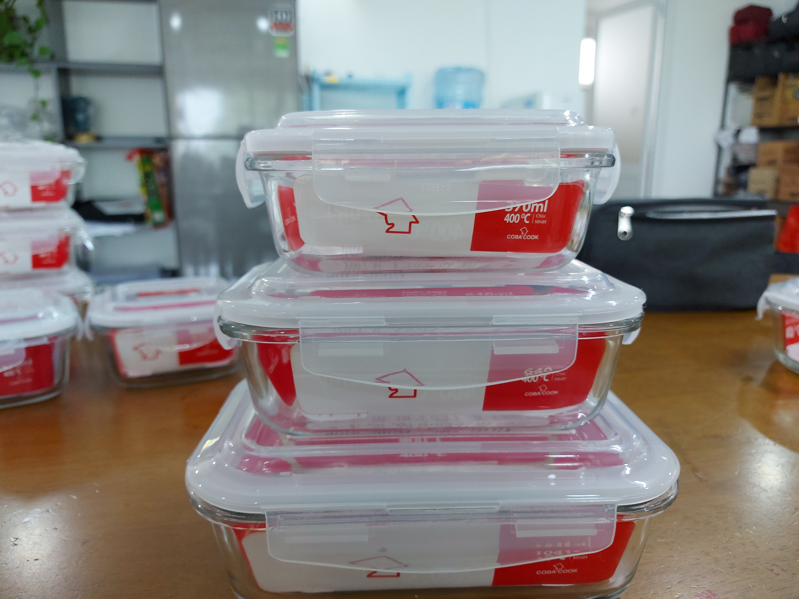 Chất liệu : Thủy tinh chịu nhiệt,nắp nhựa PP Màu sắc : Trắng trong Dung tích : Bộ hộp cơm gồm 2 hộp chữ nhật 370ml +1 túi giữ nhiệt Thương hiệu : COBA'COOK Hộp