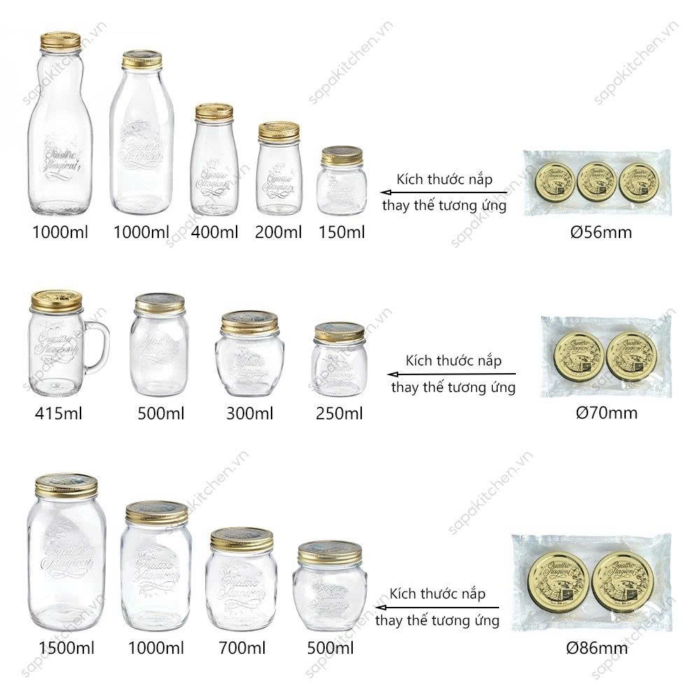 Bộ 2 nắp vặn Quattro bằng thiếc 70 mm (Bormioli Rocco) sẽ được dùng thay thế cho các hũ thủy tinh nắp vặn Quattro có dung tích tương ứng như ảnh bên dưới đây.