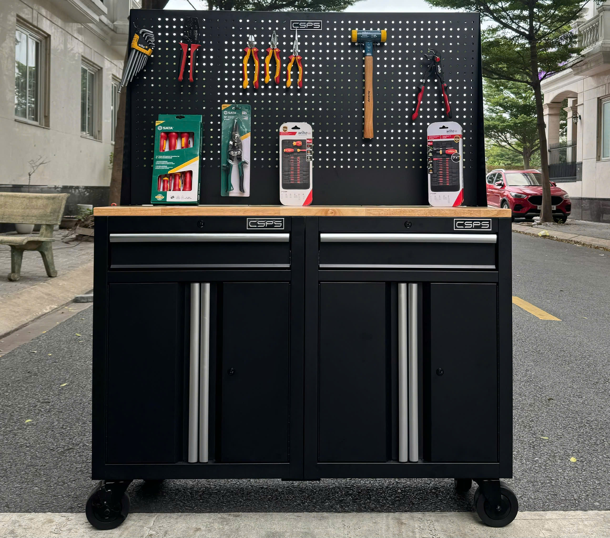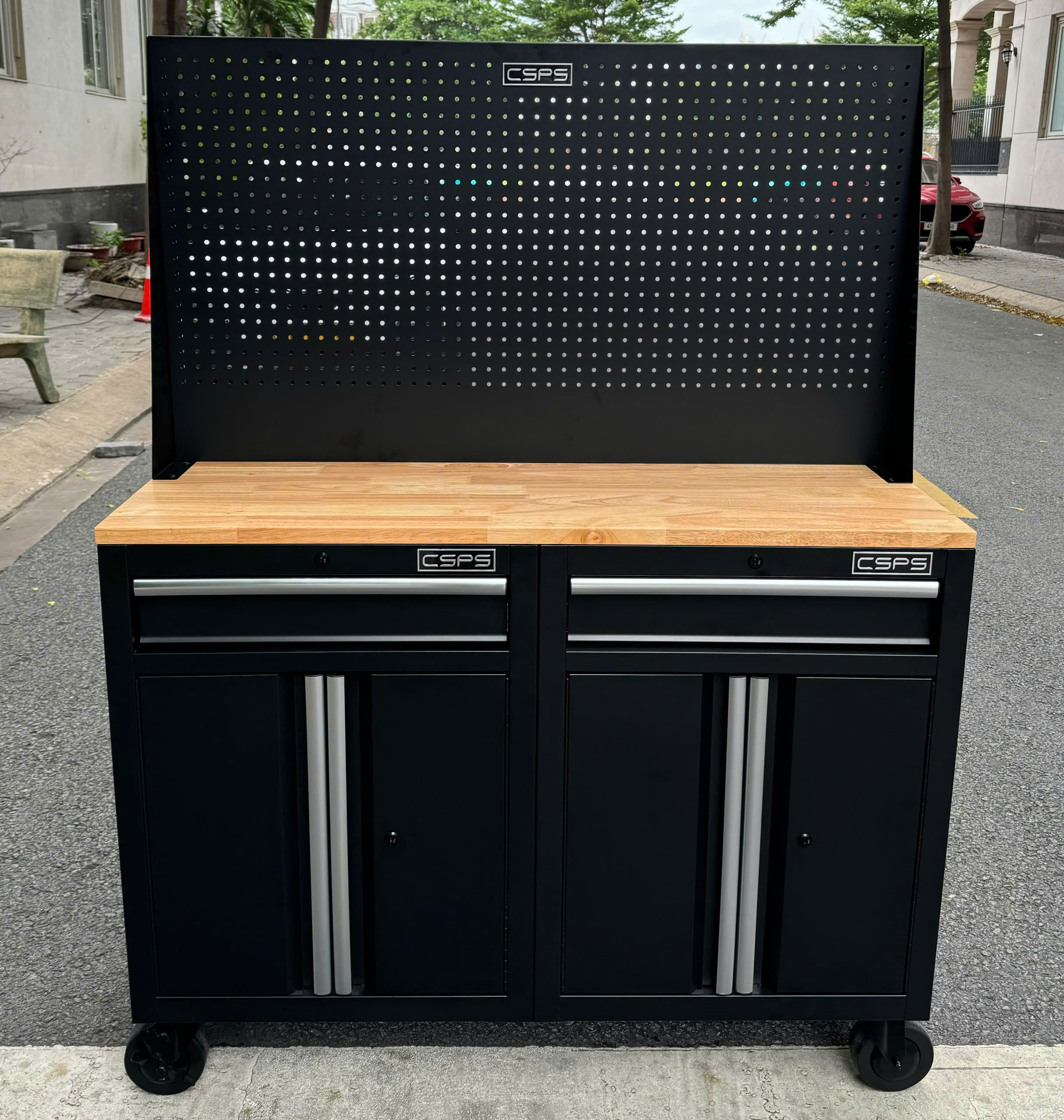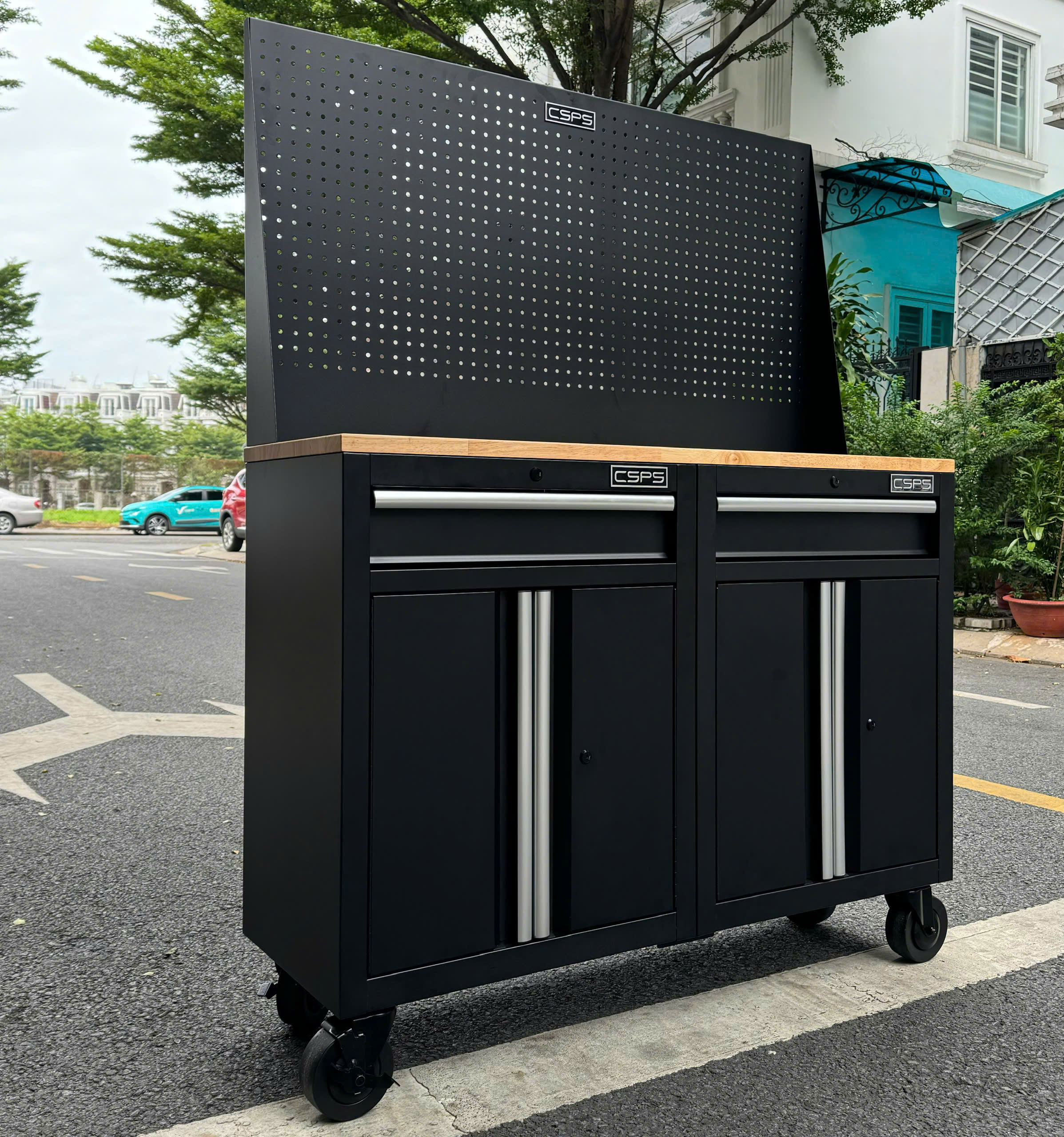 ✨Bộ 2 Tủ dụng cụ CSPS 122cm màu đen mặt ván gỗ kèm vách lưới - 02 hộc kéo (tay cầm trắng)