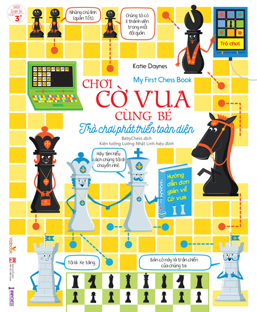 - “CHƠI CỜ VUA CÙNG BÉ – TRÒ CHƠI PHÁT TRIỂN TOÀN DIỆN” (tác giả Katie Daynes, mẹ của nhà vô địch cờ vua Anh) là một cuốn sách tuyệt vời cho các bậc phụ huynh muốn giới thiệu cho trẻ những kiến thức cơ bản về trò chơi trí tuệ này. Cuốn sách này giúp bạn tìm hiểu các quân cờ, mỗi quân cờ đều có một cách di chuyển riêng, cuốn sách dạy bạn tất cả những gì cần thiết để bắt đầu trò chơi trí tuệ này, học cách điều khiển đội quân cờ của riêng mình một cách đầy vui vẻ và hứng thú. Với 20 bài học nhỏ, cuốn sách không chỉ rèn luyện khả năng tập trung mà còn kích thích tư duy sáng tạo của trẻ. Nhiều câu đố vui hấp dẫn sẽ khiến bé tương tác và ghi nhớ kiến thức lâu hơn. Đặc biệt, phần giải đáp cho các câu đố được bố trí ở cuối sách, giúp bé tự kiểm tra và học hỏi một cách thú vị!