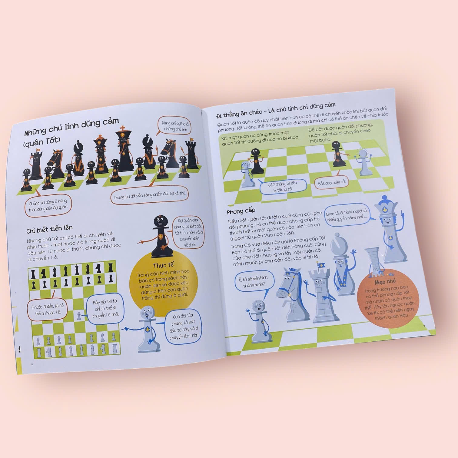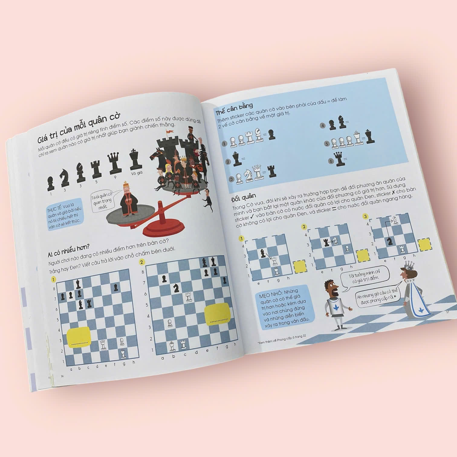 - “CỜ VUA – NHỮNG BƯỚC ĐI ĐẦU TIÊN CỦA KIỆN TƯỚNG” là một tài liệu tuyệt vời với hơn 80 chủ đề cơ bản, từ khai cuộc đến trung cuộc và tàn cuộc. Cuốn sách cung cấp hướng dẫn chi tiết và minh họa sinh động về lịch sử cũng như các kỹ thuật và chiến thuật cờ vua, phù hợp cho mọi lứa tuổi, đặc biệt là những người mới bắt đầu và những ai muốn nâng cao lối chơi của mình. Ngoài ra, sách còn chứa đựng nhiều mẹo hay để thiết lập những cái bẫy đầy bất ngờ, tính toán các nước đi khéo léo, tấn công hiệu quả và bảo vệ quân cờ, nhằm đạt được chiến thắng tối ưu. Thêm vào đó, nhiều câu đố thú vị sẽ thử thách trí tuệ của bé, với đáp án được công bố ở cuối mỗi trang.