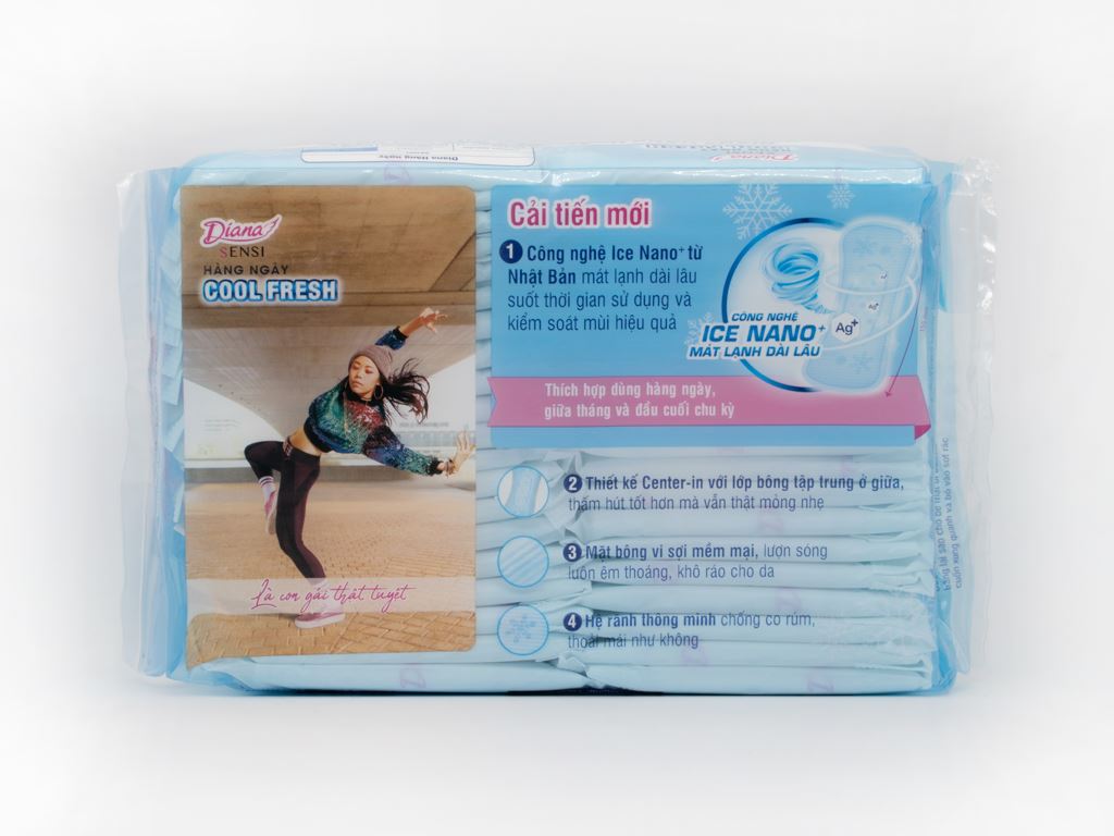 Mua tại TiktokTHÔNG TIN SẢN PHẨM Băng vệ sinh Diana hàng ngày Sensi Cool Fresh (gói 20 miếng) là loại băng vệ sinh đáp ứng các yêu cầu vừa mềm mại, vừa thấm hút tốt, đồng thời phải thật mỏng nhẹ như không và không co dúm của phái đẹp. Sản phẩm ứng dụng công nghệ vi sợi kép độc quyền của Tập đoàn Unicharm, vừa có bề mặt vi sợi thấm tan chất dịch đặc (đặc trưng cho dòng sản phẩm Diana Sensi), siêu mỏng nhẹ, cho cảm giác êm mềm tối đa. Sản phẩm là sự lựa chọn tốt nhất dành cho phái đẹp trong việc chăm sóc vệ sinh cá nhân.