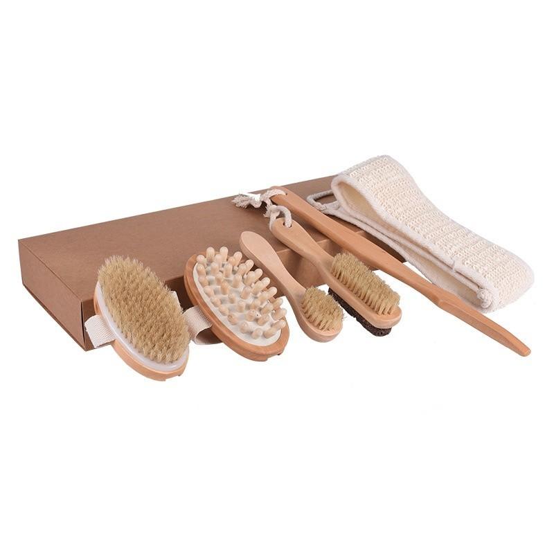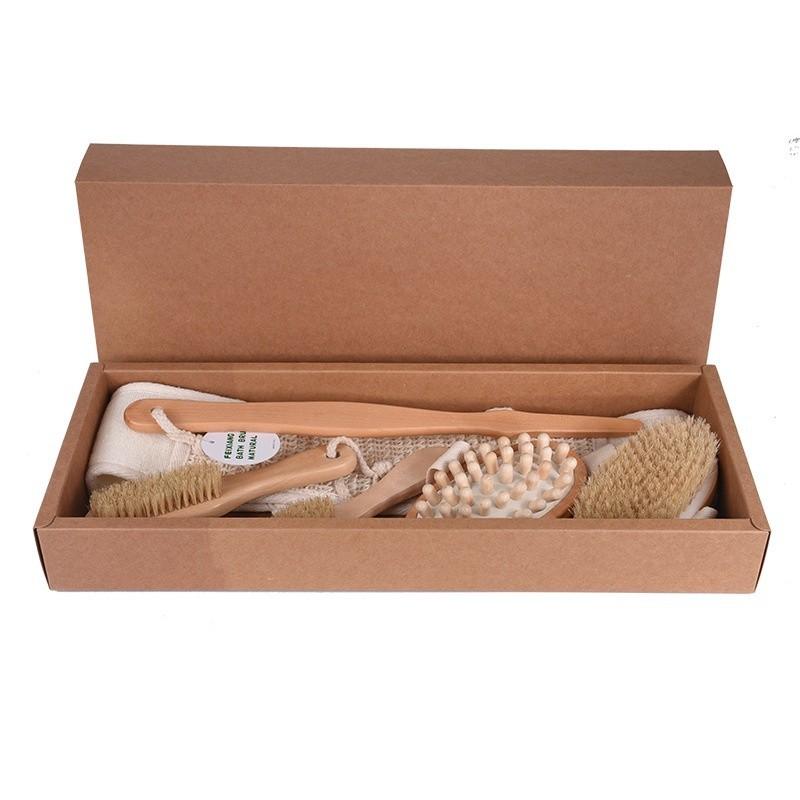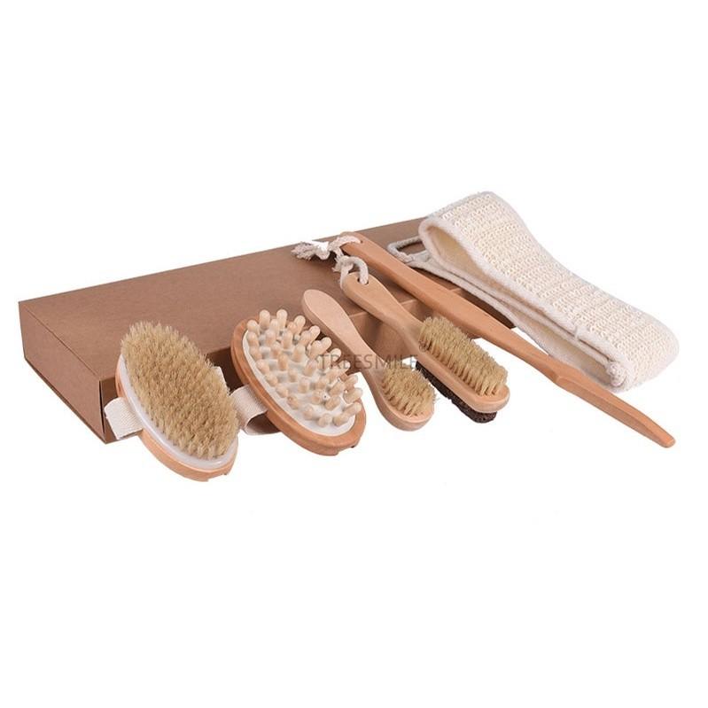 Bộ sản phẩm bao gồm 5 món bàn chải tắm đa năng, được sản xuất tại Việt Nam từ gỗ tự nhiên loại tốt.