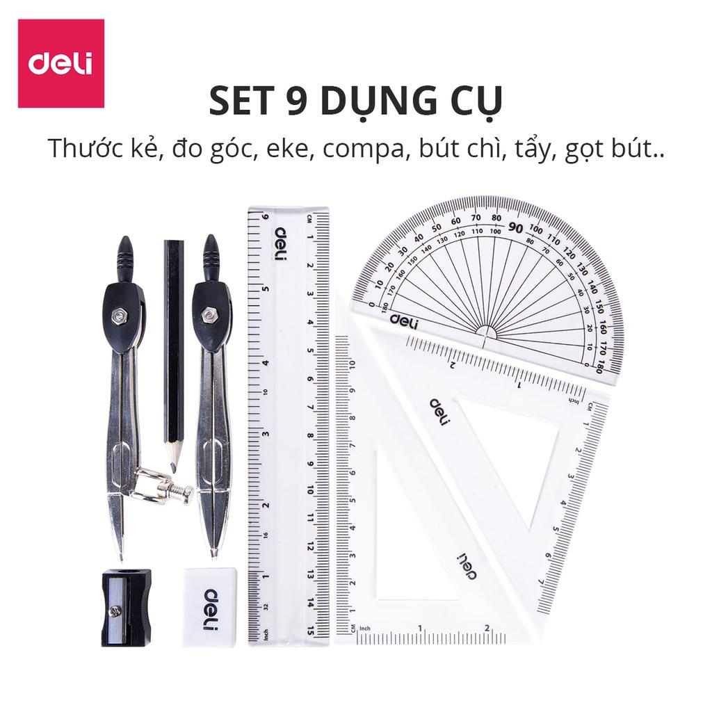 ✨Bộ 9 dụng cụ đo lường Học sinh Deli - Compa, Eke, Thước kẻ, Bút chì, Thước đo góc, Gọt chì, Tẩy - Kèm Hộp Sắt Tiện Dụng