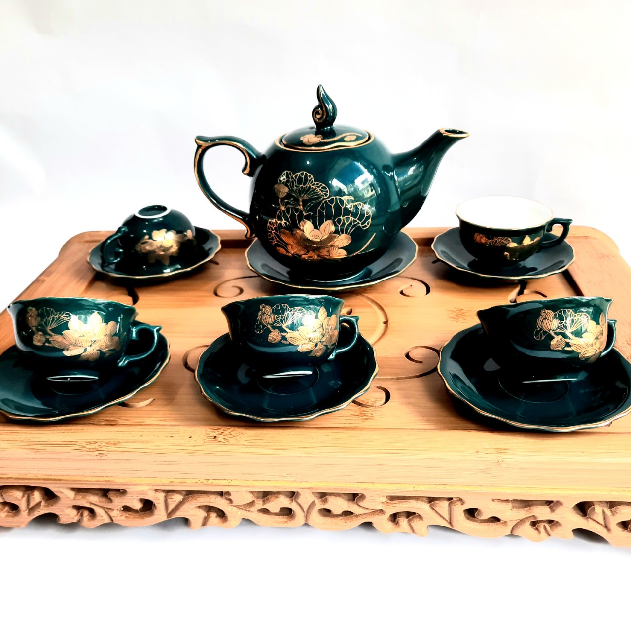 - Bộ sản phẩm không bao gồm khay. Đặc điểm nổi bật: Bộ ấm chén Bát Tràng cao cấp phú quý Mallard màu xanh Arctic họa tiết hoa sen vẽ vàng 24k +100% sản phẩm được khử chì, độc tố ở nhiệt độ là 1350d tiêu chuẩn xuất khẩu đã được đăng ký nhãn hiệu độc quyền, đáp ứng yêu cầu khắt khe nhất kể cả thị trường khó tính như Châu Âu.