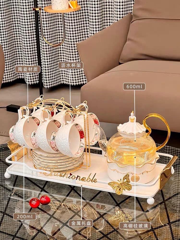 • Bộ sản phẩm gồm: 1 ấm thủy tinh + 6 chén + 6 đĩa đặt + 1 khay đựng