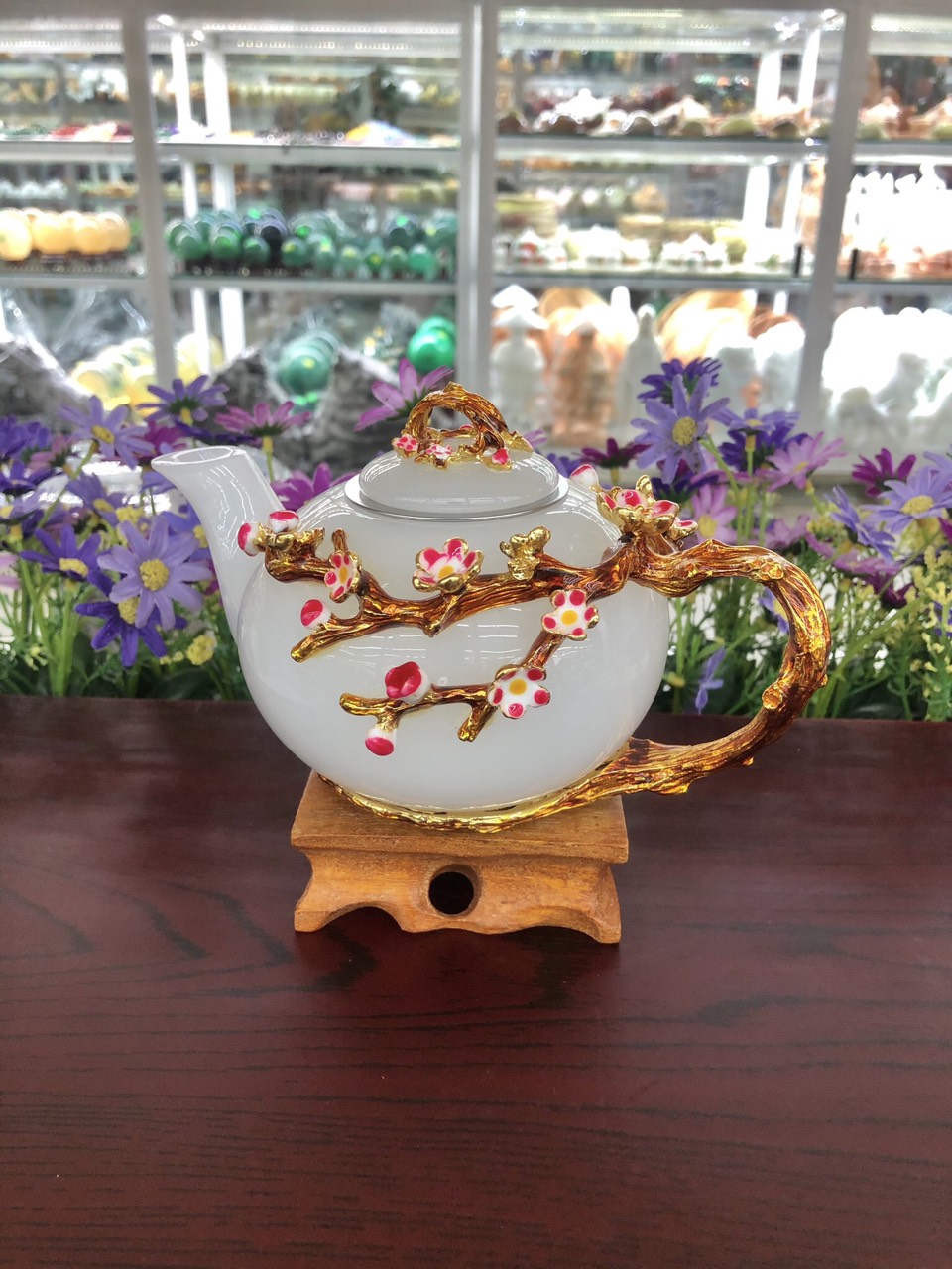 ✨Bộ ấm trà chạm hoa mai với ly chạm chữ đá bạch ngọc