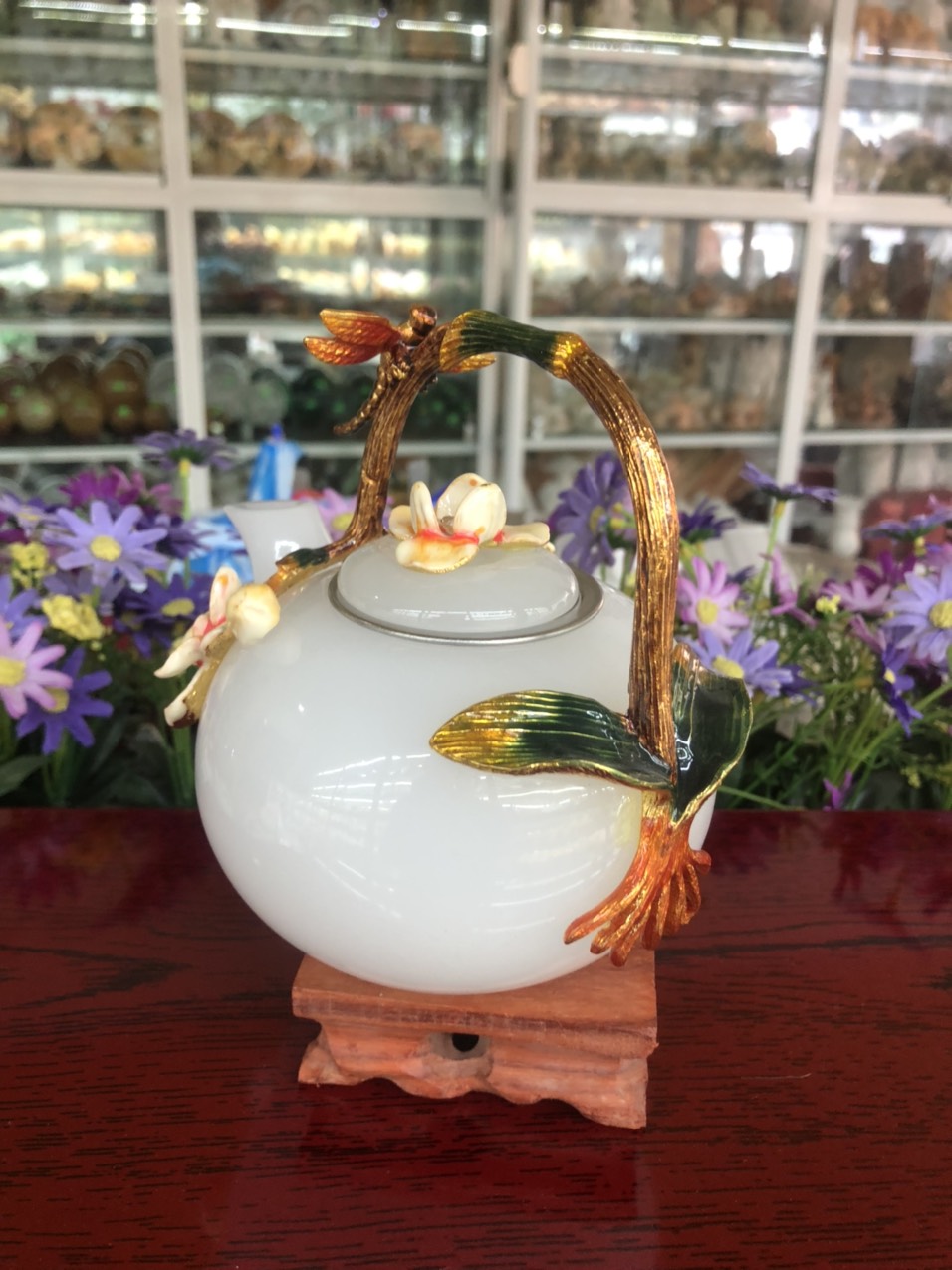 ✨Bộ ấm trà chạm hoa và con chuồn chuồn với quai xách đá bạch ngọc