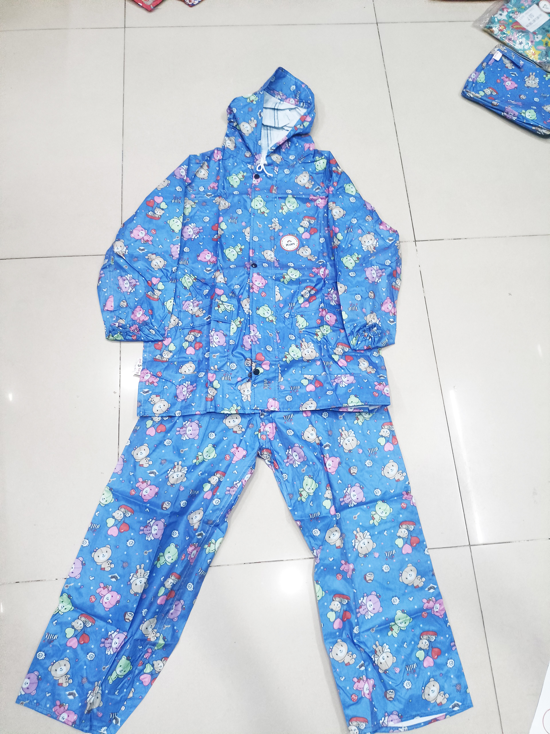 Chất liệu: Polyester, chống thấm nước Màu sắc: màu Hồng, Xanh biển Kích thước: thích hợp bé cao dưới 1M3, nặng 25kg đổ lại Bộ sản phẩm: 1 áo mưa, túi đựng áo mưa Kiểu