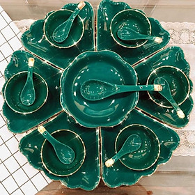 BỘ BÁT ĐĨA HOA MẶT TRỜI SEN XANH 18 CHI TIẾT - TRỌN BỘ gồm : - 1 Bộ 6 cánh đĩa + bát tô tạo hình bông hoa , đk cả bộ 45cm rất