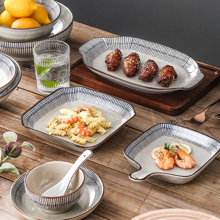 Bộ Bát Đĩa Gốm Sứ Hoa Văn Lá Dọc Phong Cách Nhật Bản Họa Tiết Thổ Cẩm, Thiết Kế Sang Trọng