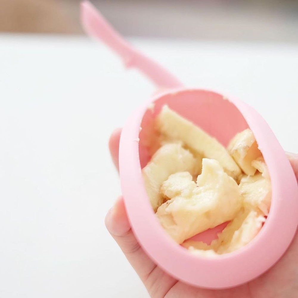 Cán thìa dẹt, chắc chắn cùng với lòng bát có gờ giúp mẹ nghiền thức ăn dễ dàng