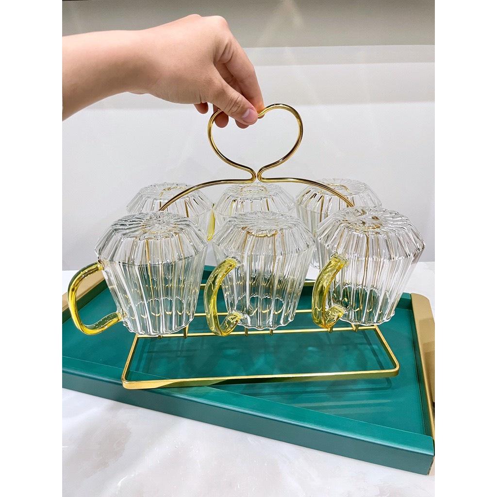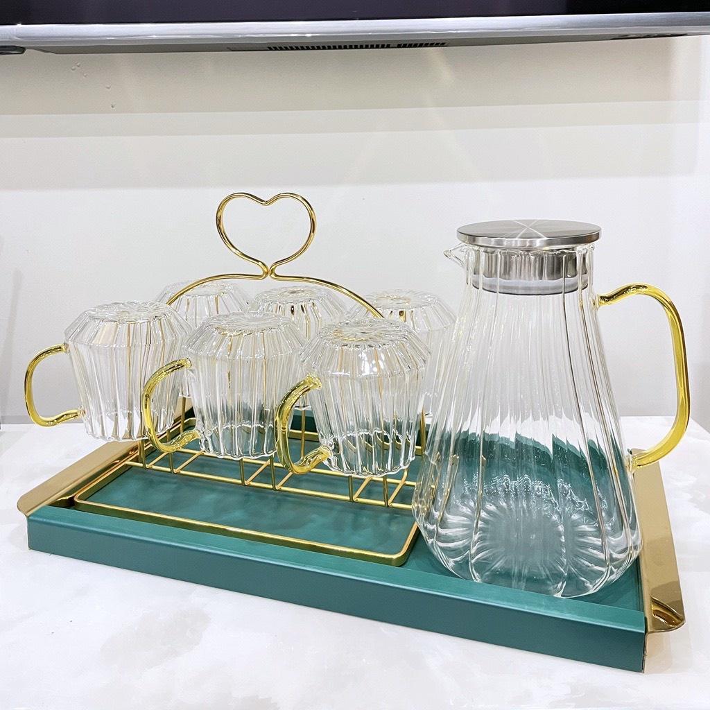 ✨BỘ BÌNH ĐỰNG NƯỚC UỐNG THỦY TINH VÂN SỌC KÈM 6 CỐ KHAY VÀ GIÁ ÚP