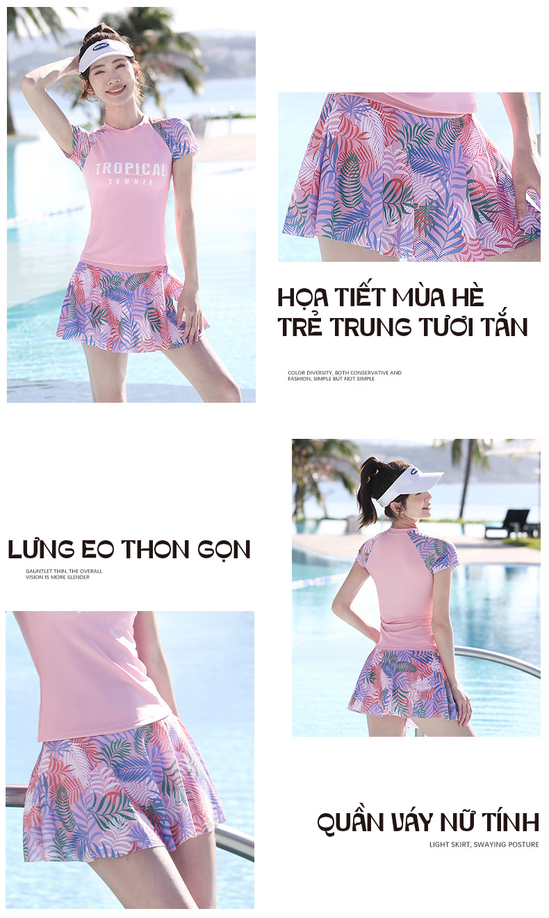 - Set bơi xinh xắn bao gồm: Áo bơi + Quần short đùi bơi + Chân váy bơi. - Có thể sử dụng 2 chi tiết khi bơi, 3 chi tiết khi đi chơi, đi