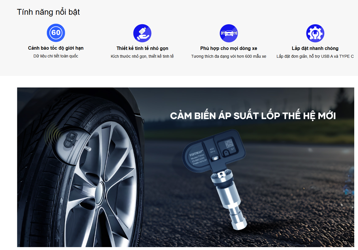 Mua tại TiktokVIETMAP TW50 là bộ cảm biến áp suất lốp cao cấp dành cho ô tô, trang bị cả màn hình hiển thị riêng và khả năng kết nối với màn hình của xe thông qua ứng dụng VIETMAP Live. TW50 mang lại trải nghiệm giám sát lốp an toàn, tiện lợi và hiện đại vượt trội so với các dòng TPMS thông thường. Tính năng nổi bật Cảnh báo tốc độ giới hạn Dữ liệu chi tiết toàn quốc Thiết kế tinh tế nhỏ gọn Kích thước nhỏ gọn, thiết kế tinh tế Phù hợp cho mọi dòng xe Tương thích đa dạng với hơn 600 mẫu xe Lắp đặt nhanh chóng Lắp đặt đơn giản, hỗ trợ USB A và TYPE C
