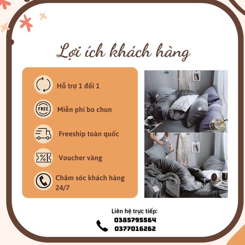 Sản phẩm gồm: 2 lựa chọn Lựa chọn 1 : Set vỏ chăn : 1 VỎ CHĂN + 1 GA BỌC NỆM + 2 VỎ GỐI NẰM Lựa chọn 2 :set chăn Phao: 1 Chăn