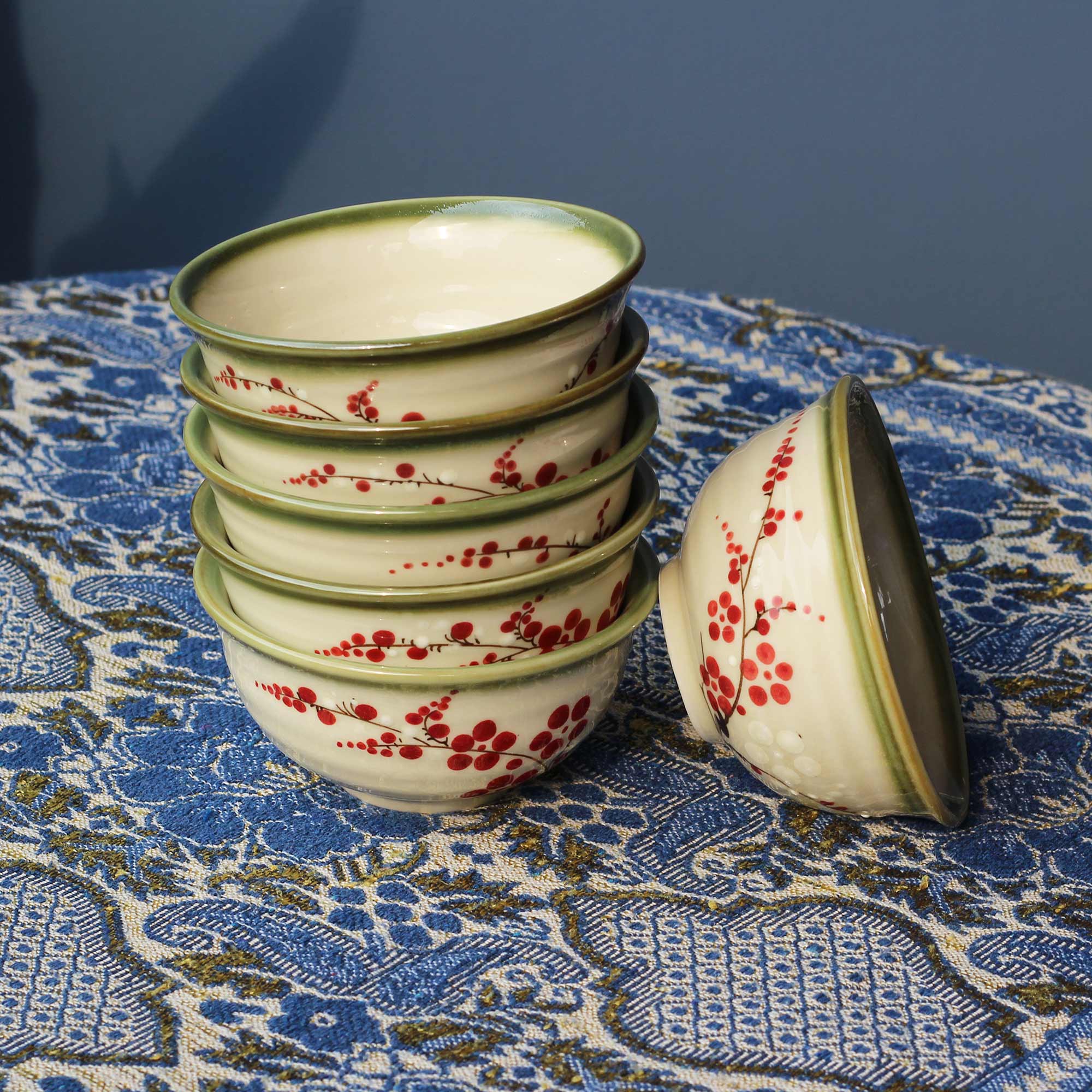 Bộ sáu chiếc Bát Pomona 5,5 inch/14cm này có hoa văn hình minh họa thực vật đẹp mắt. Mỗi bát trưng bày một họa tiết trái cây khác nhau: Táo, Cherry, Blackberry, Lê, Mơ và