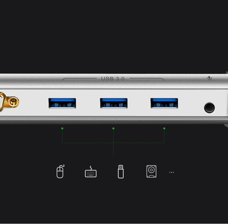 - Hub USB type-C chuyển đổi đa năng Ugreen 40373 chuyển đổi nhiều màn hình hỗ trợ USB 3.0 hub + Thẻ SD / TF đọc + Gigabit Lan + Audio (mic + tai nghe) + VGA + HDMI + DVI.