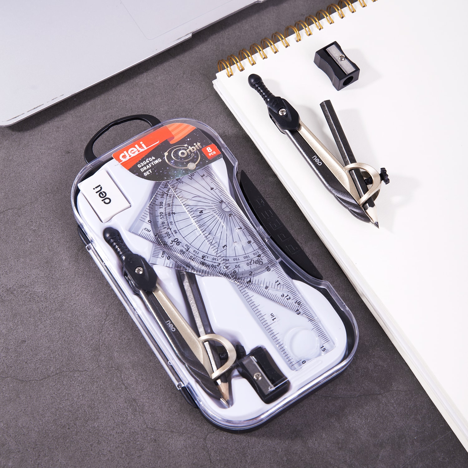 TÍNH NĂNG SẢN PHẨM: ️Làm bằng chất liệu hợp kim ️Thiết kế chắc chắn, sử dụng bền lâu ️Bề mặt sơn kim loại chất lượng cao cho độ bền ️Bộ dụng cụ được thiết kế nhỏ gọn, đầy đủ để phục vụ việc học mà không cần phải mua lẻ. ️Bộ sản phẩm Deli bao gồm