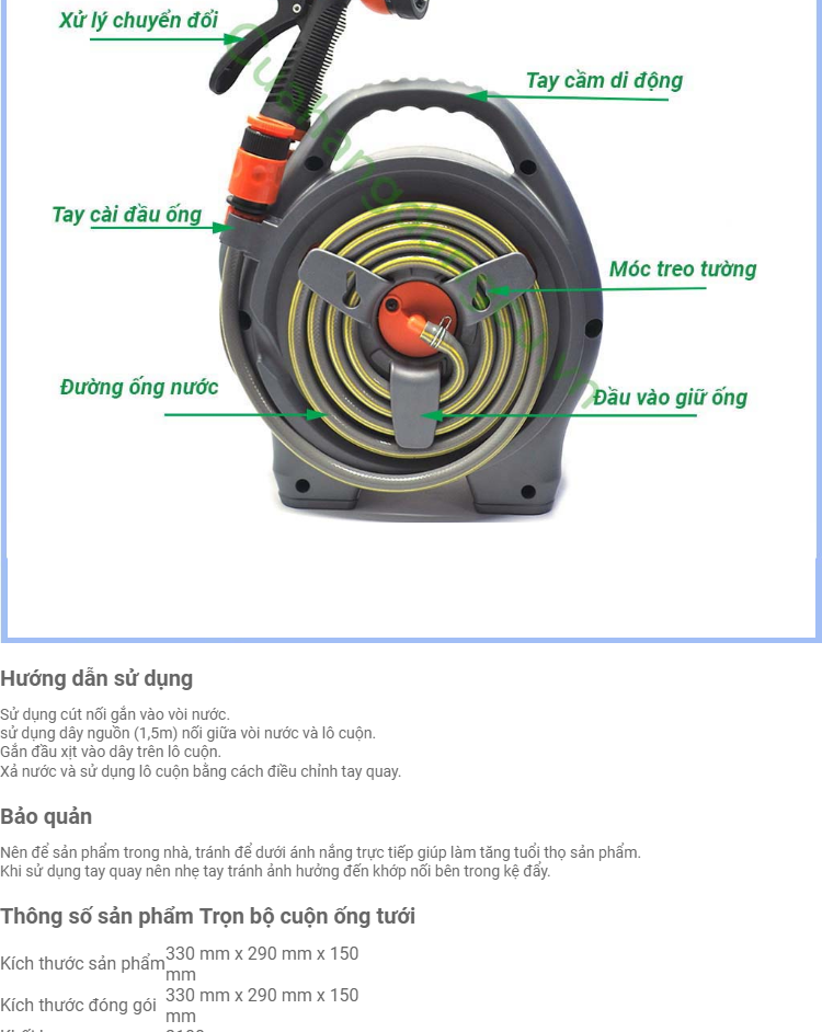 Màu sắc Như hình đại diện Khối lượng 1.3 kg Kích thước (Dài x rộng x cao) Đóng hộp : 32 x 20 x 19 cm Dài Dây dẫn tưới 15m Chất liệu Nhựa PVC