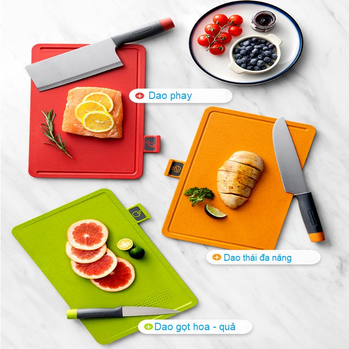 - Bộ dao thớt chuyên nghiệp: Dùng phân loại thực phẩm sống, chín dễ dàng.