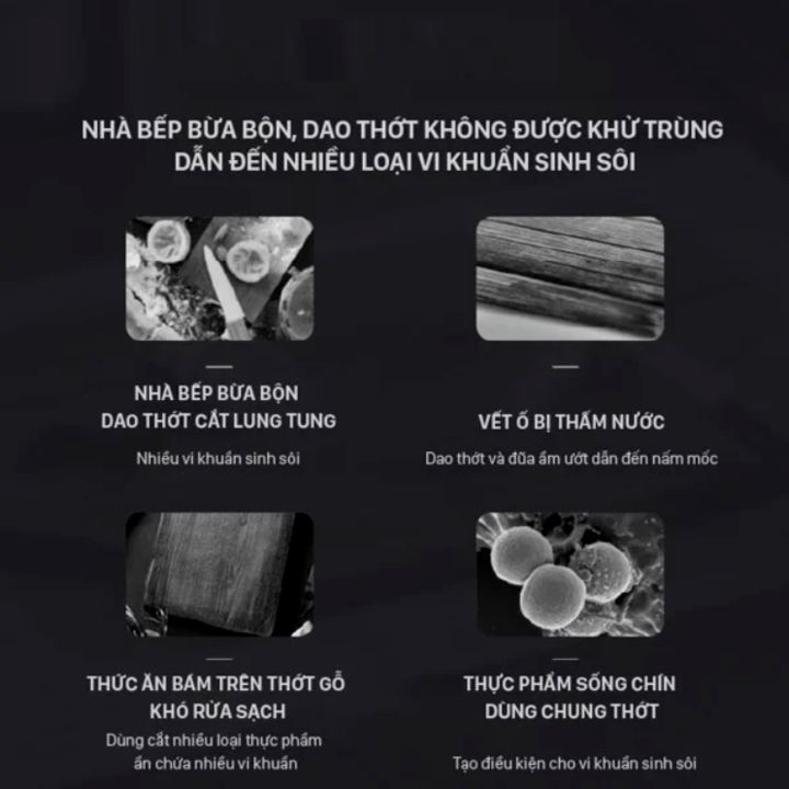 - Thiết kế ngăn đựng đũa và 3 bộ dao hiện đại: Giúp diệt khuẩn toàn diện. Lý Do Nên Sử Dụng Bộ Dao Thớt Khử Trùng MR1002 Nhà bếp bừa bộn không ngăn nắp, dao thớt muỗng đũa không được khử trùng kỹ càng có thể dẫn đến tình trạng khiến nhiều loại vi khuẩn có cơ hội sinh sôi sinh phát triển, tiềm ẩn những nguy hiểm cho sức khỏe. Hãy sử dụng Bộ Dao Thớt Khử Trùng MR1002 để loại bỏ ngay những vấn đề liên quan đến vi khuẩn: