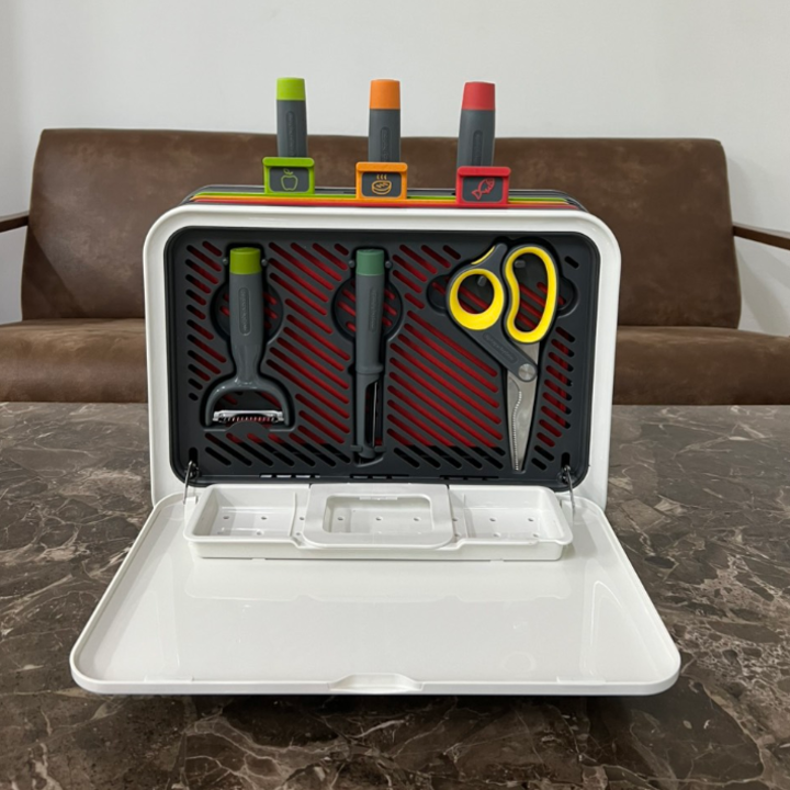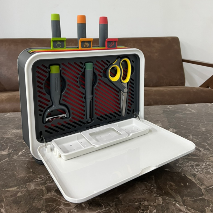 - Tất cả chỉ trong 1 bộ: Có thể cất giữ 3 thớt 6 dao và 10 đôi đũa gọn gàng trong 1 chiếc máy.
