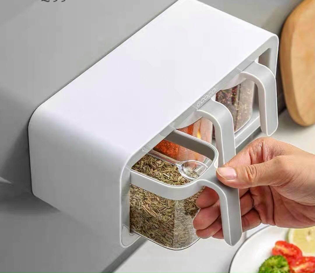 HŨ ĐỰNG GIA VỊ 4 NGĂN CÓ NẮP ĐẬY kèm thìa cao cấp - Henrysa Ưu Điểm Sản Phẩm Bộ sản phẩm gồm: 04 hũ đựng + 4thìa nhựa • Khay đựng gia vị 4
