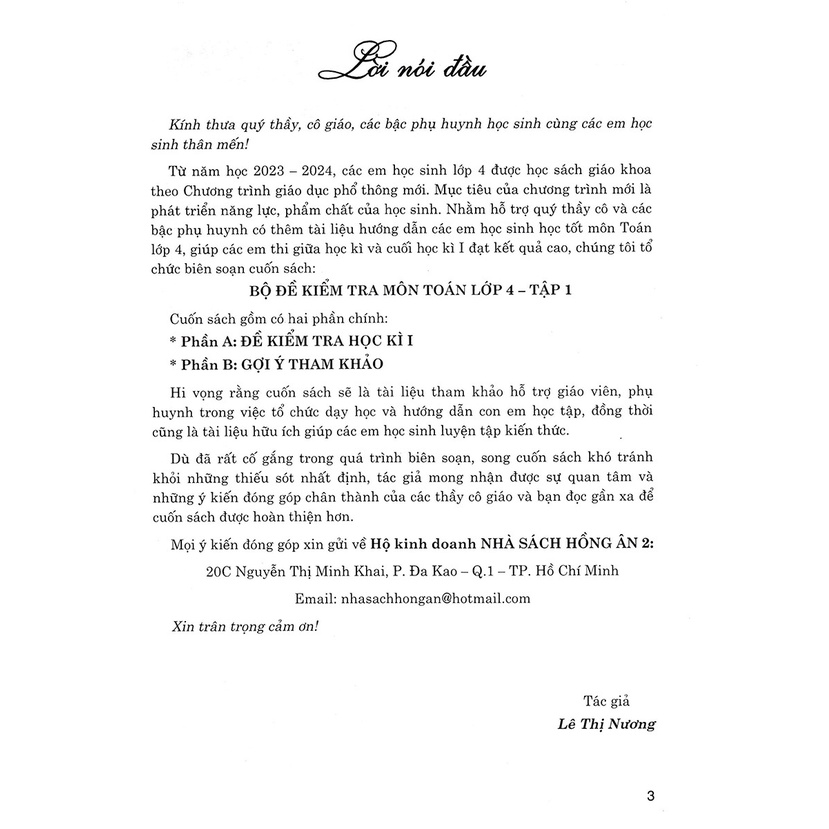 Từ năm học 2023 – 2024, các em học sinh lớp 4 được học sách giáo khoa theo Chương trình giáo dục phổ thông mới. Mục tiêu của chương trình mới là phát triển năng lực, phẩm chất của học sinh. Nhằm hỗ trợ quý thầy cô và các bậc phụ huynh có thêm tài liệu hướng dẫn các em học sinh học tốt môn Toán lớp 4, giúp các em thi giữa học kì và cuối học kì I đạt kết quả cao, chúng tôi tổ chức biên soạn cuốn sách: