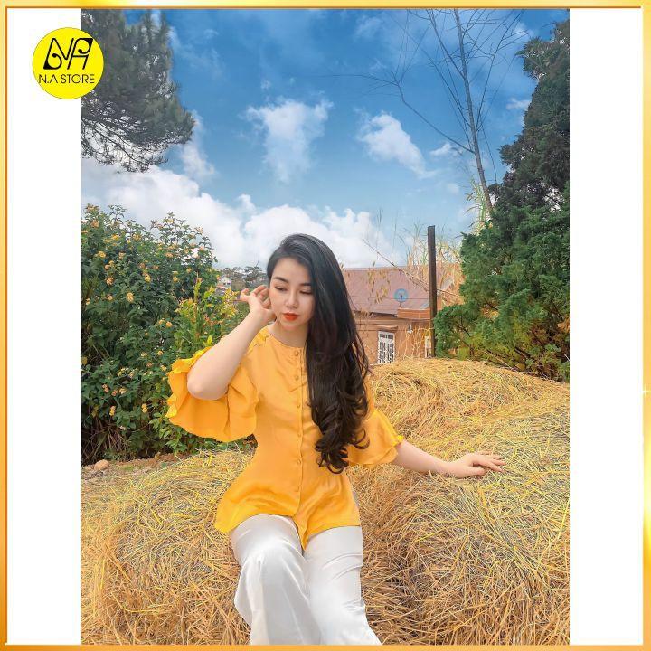 - Áo thiết kế cổ tròn + tay thiết kế xòe hiện đại thời trang