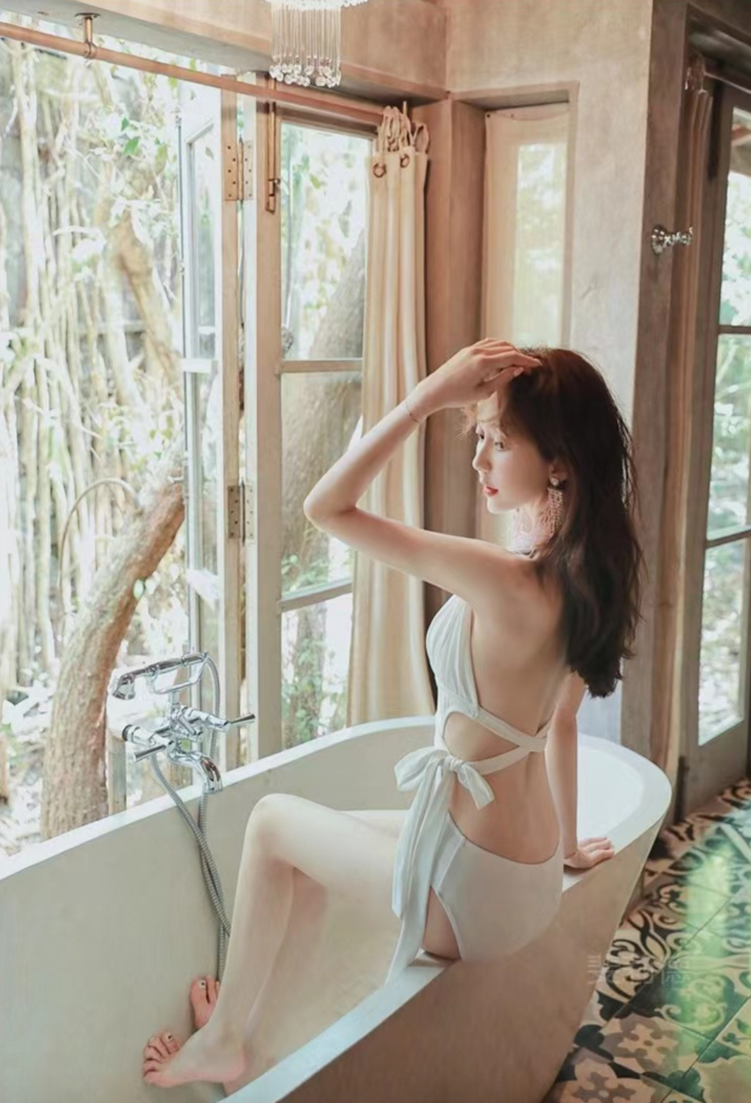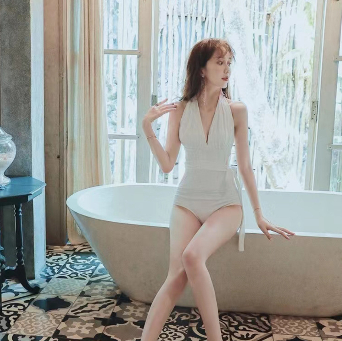 - Chất vải nhung tuyết mềm, co giãn tốt, mặc vừa ôm sát mà vẫn tạo sự mềm mại. - Đồ bơi trắng nhưng nhờ dáng váy chữ A xoè nên mặc sẽ cực kì