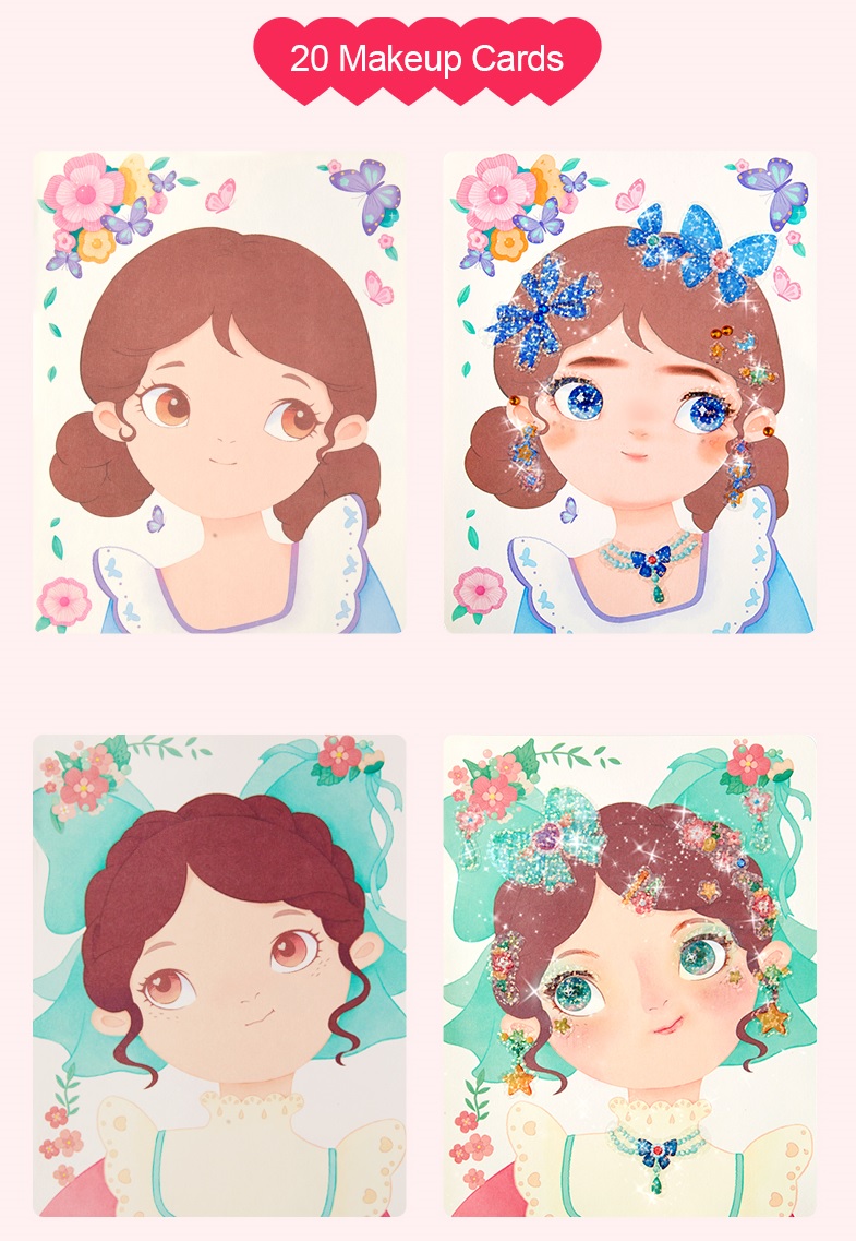 Bộ trang điểm Mideer bao gồm: 20 mẫu trang điểm công chúa, 4 mẫu nhãn dán kim cương, 4 mẫu nhãn dán sáng bóng, 4 nhãn dán, 6 màu, 900 viên kim cương, 10 chất liệu vải, 1 tấm, 1 bút đính cương, 1 keo dán, 2 cọ trang điểm