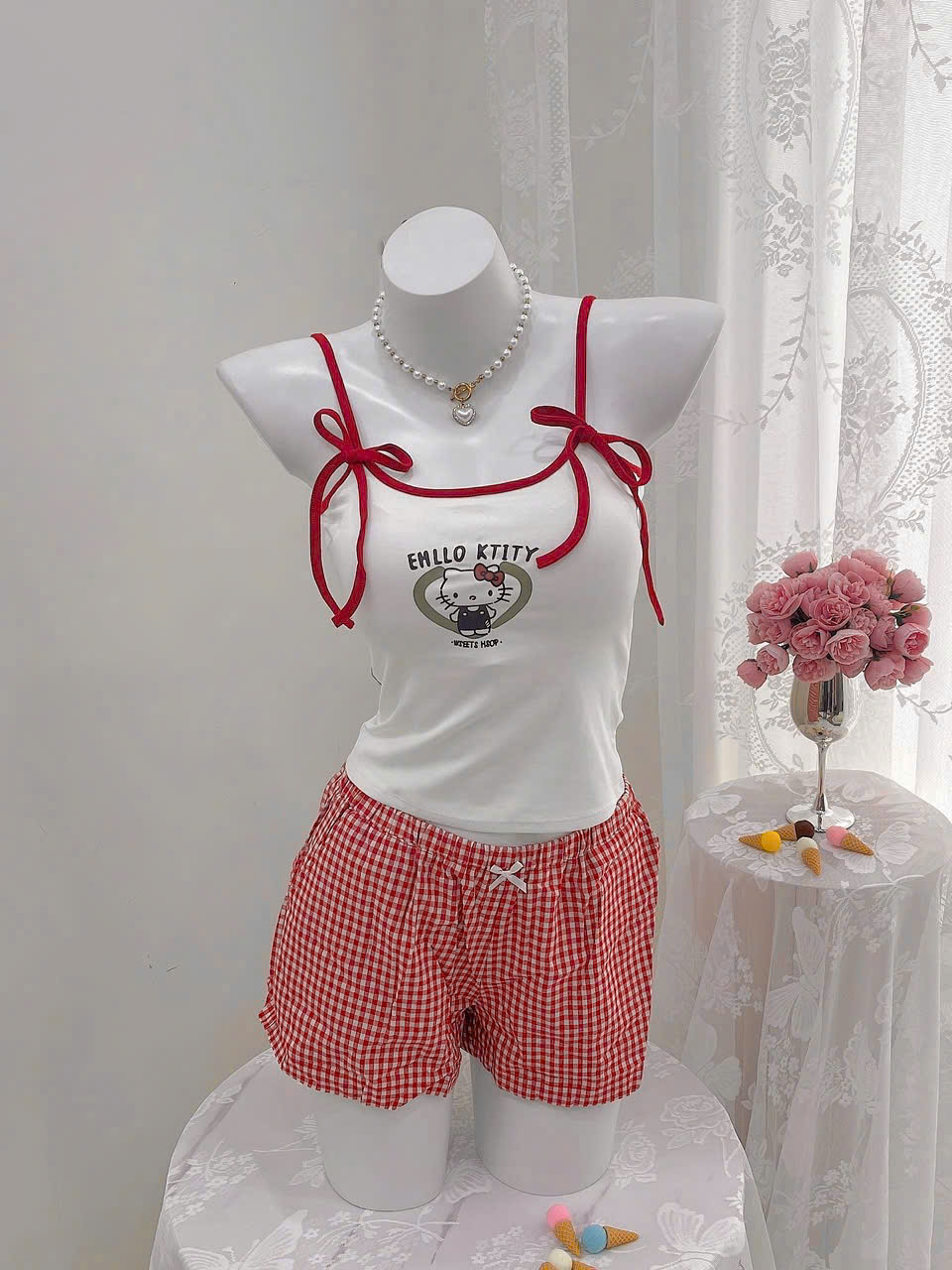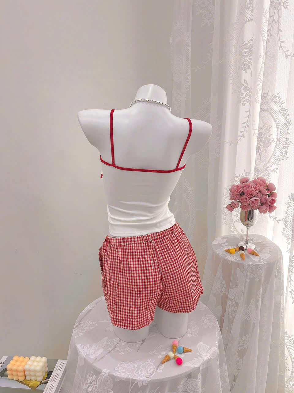 Thương hiệu: Sanny House Tên sản phẩm: Bộ đồ ngủ Chất liệu: cotton cao cấp mềm mịn, co giãn, thấm hút tốt Kiểu dáng: gợi cảm, trẻ trung, hiện đại Màu: trắng caro đỏ Size: