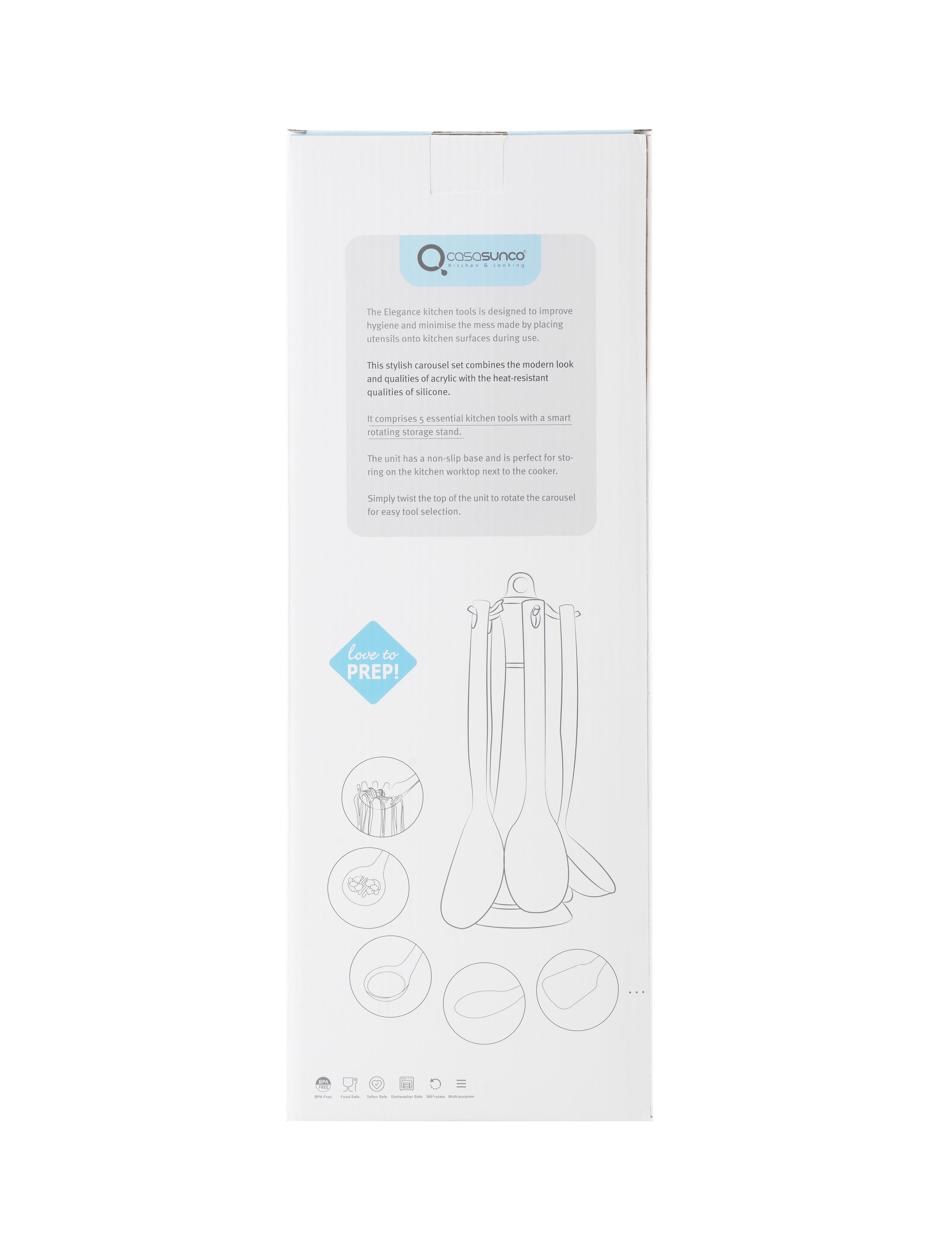 Năm dụng cụ nhà bếp thiết yếu được lồng trong một thiết kế nhỏ gọn, tự hỗ trợ Được làm từ nylon cường lực, tất cả các dụng cụ đều có khả năng chịu nhiệt