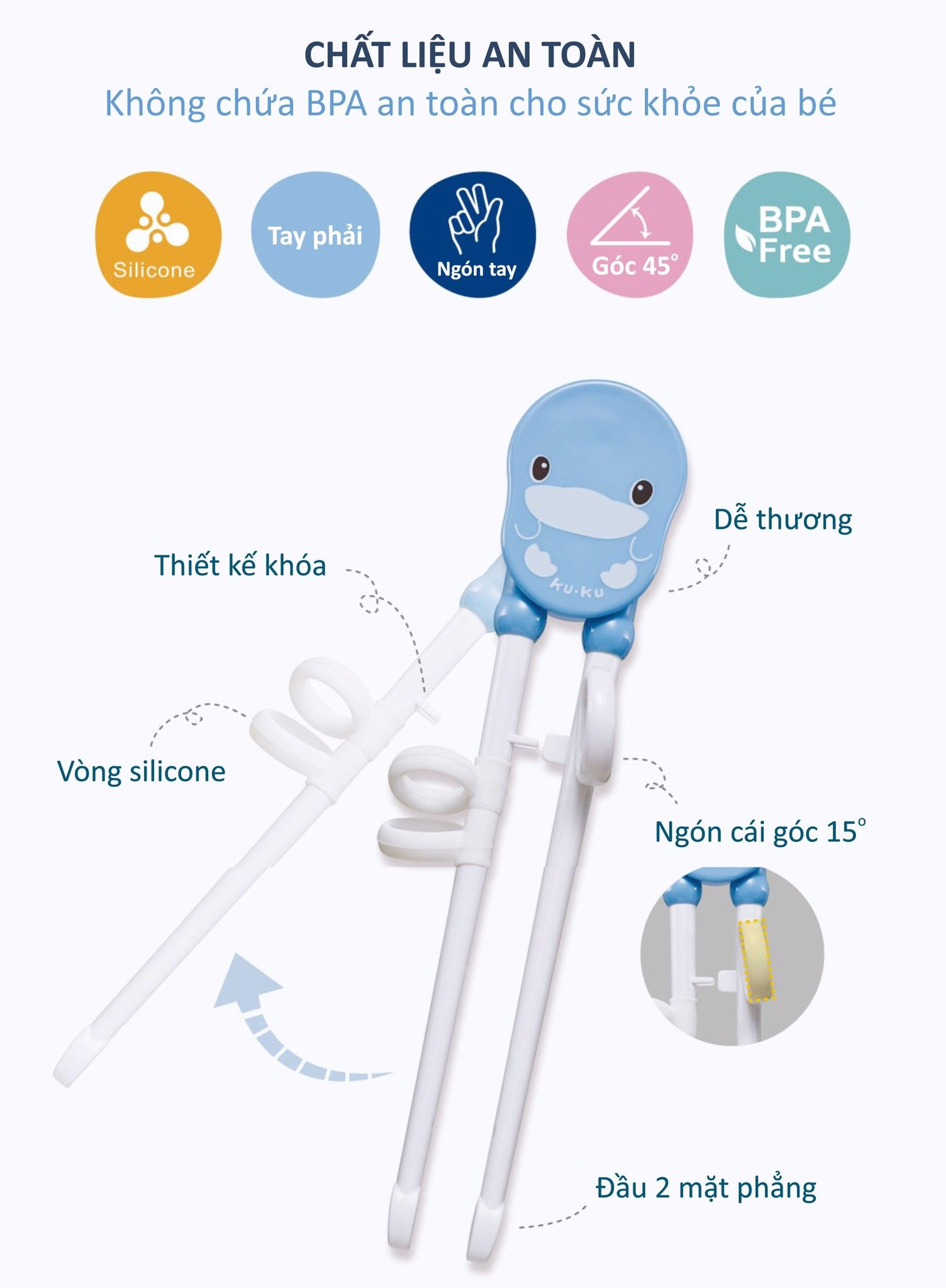 Mua tại TiktokĐũa Tập Ăn Cho Bé KuKu KU3038 sẽ giúp bé tập làm quen với việc sử dụng đũa bằng tay phải trong bữa ăn. Sản phẩm được làm từ chất liệu cao cấp không chứa chất BPA nên bố mẹ có thể yên tâm hơn khi cho con mình sử dụng. Sản phẩm có hai màu xanh và hồng, mẹ có thể lựa chọn màu sắc thích hợp với sở thích của trẻ.