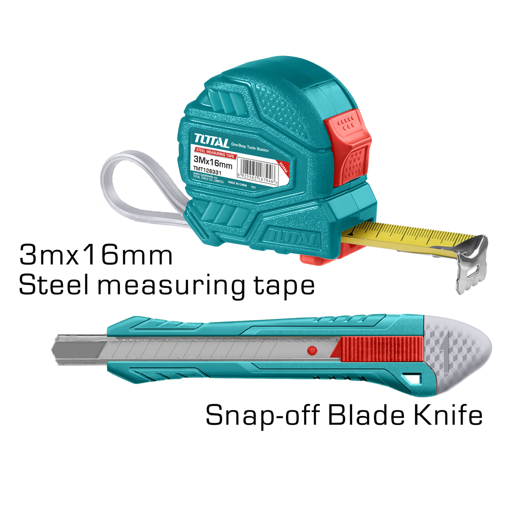 • Đa dạng các công cụ: Bộ công cụ TOTAL THKTHP90066 bao gồm 6 dụng cụ khác nhau, cung cấp các công cụ cần thiết để thực hiện các công việc cơ bản. Điều này bao gồm tua vít, dao rọc giấy, kềm, thước và các công cụ khác.