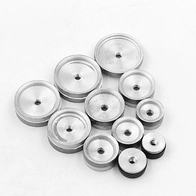 Mua tại TiktokBộ dụng cụ ép đáy đồng hồ cơ bản bao gồm bàn ép và các đĩa nhựa cỡ khác nhau có đường kính từ 18mm đến 38mm