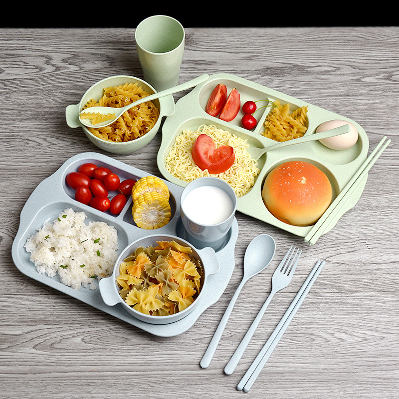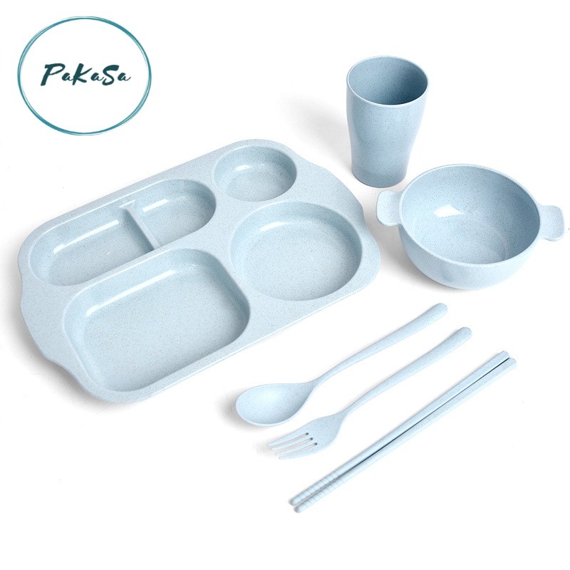 Bộ ăn dặm lúa mạch cho bé (Có nắp 06 món: Đựng cơm, đựng đồ ăn, ly cốc, thìa, dĩa, đũa)