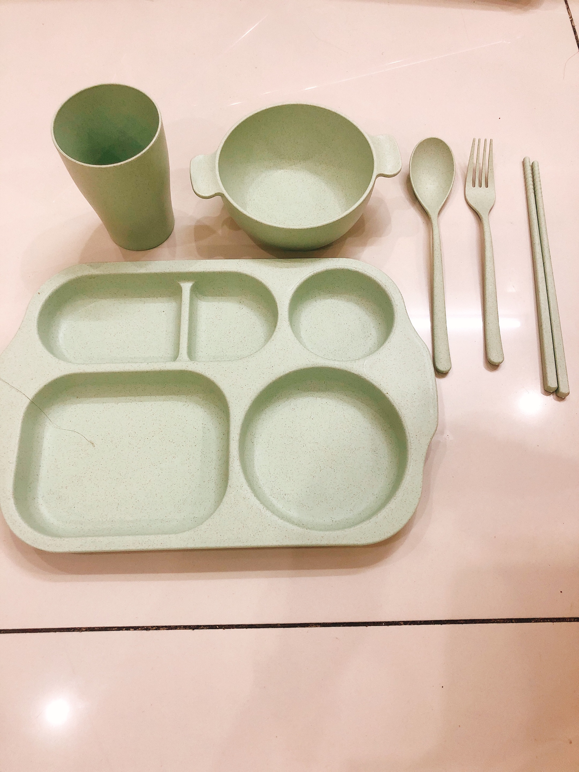 - Khay ăn dặm lúa mạch bao gồm: 1 khay + 1 bát + 1 cốc + 1 thìa + 1 đôi đũa + 1 dĩa