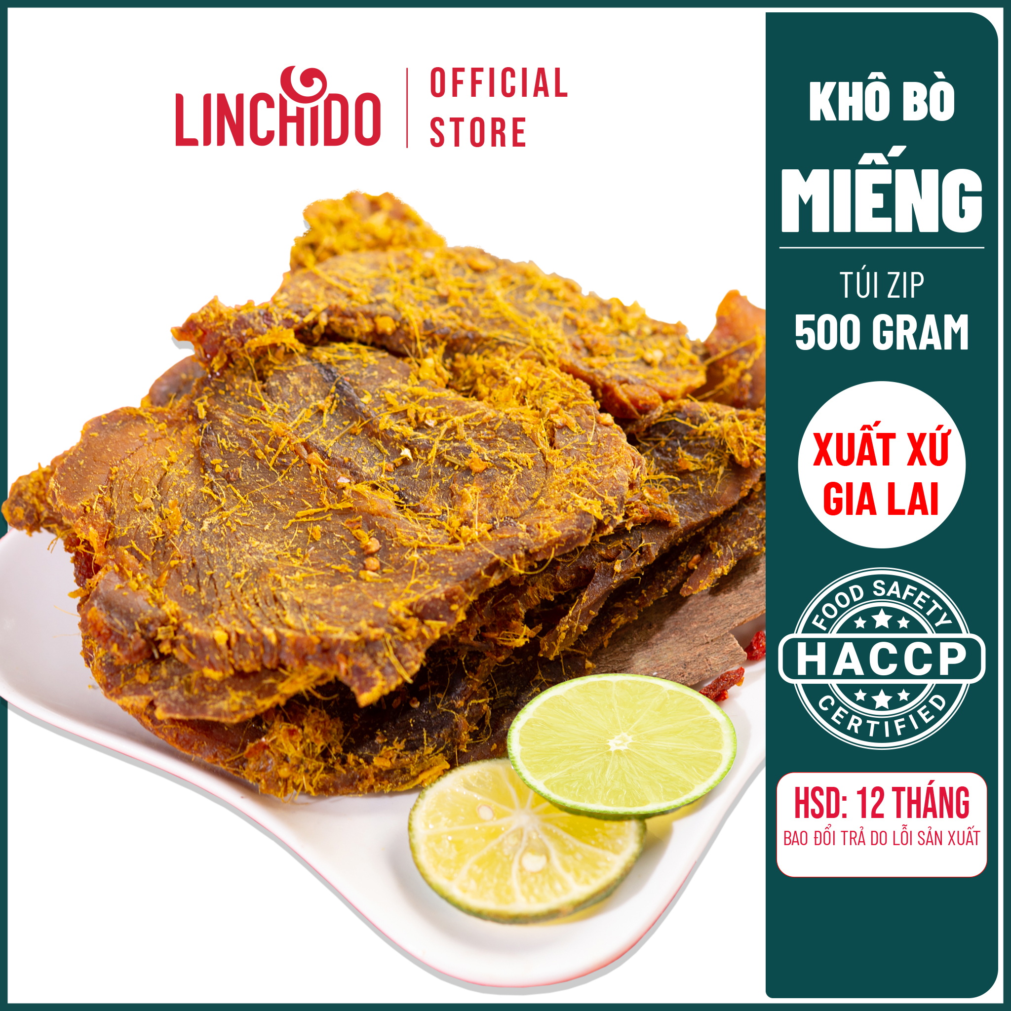 KHÔ BÒ MIẾNG MỀM DAI Xuất xứ: Việt Nam. Hạn sử dụng: In trên bao bì Quy cách: HỘP 500G Thành phần: + Thịt bò đùi sạch 100%. + Ớt, tỏi, sả, ngũ vị hương