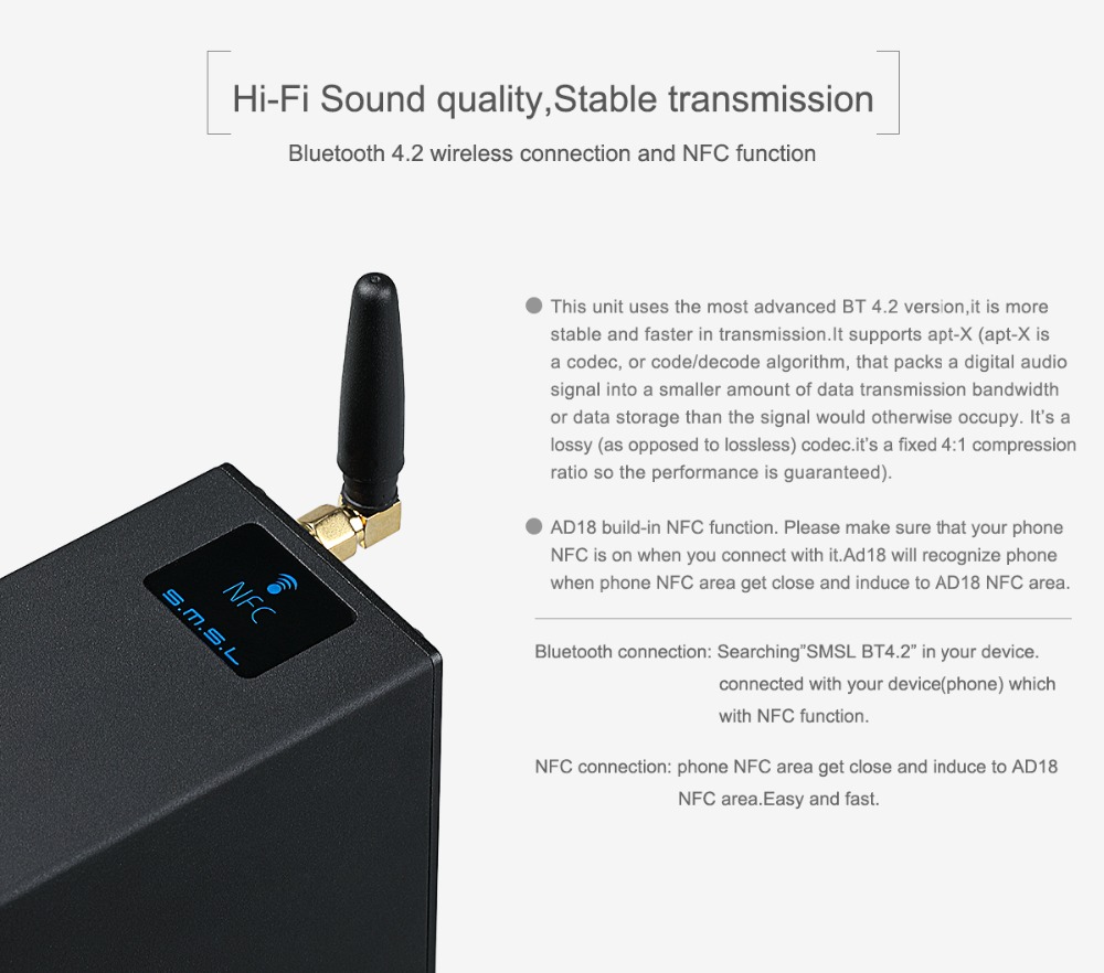 - Customized BT4.2 Bluetooth module, Supports apt-X, easily connect with Bluetooth by NFC
