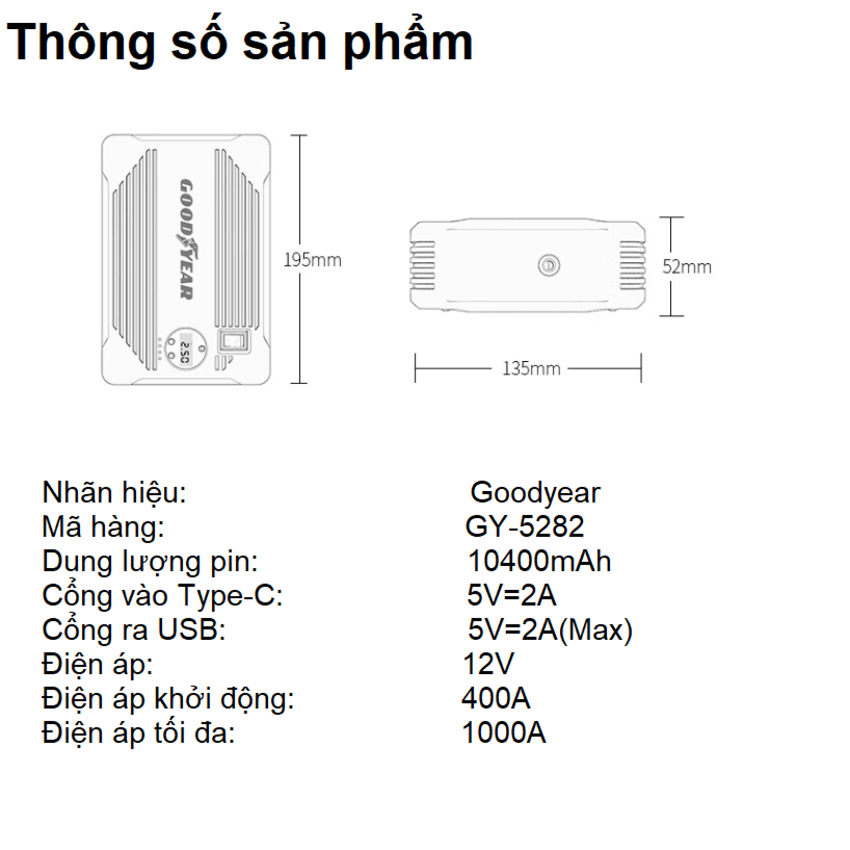 Giới thiệu kík n.ổ kiêm pin sạc dự phòng Goodyear GY-5295 - Được sản xuất từ những linh kiện chất lượng cao với quy trình kiểm soát nghiêm ngặt bộ kík ắc quy ô tô