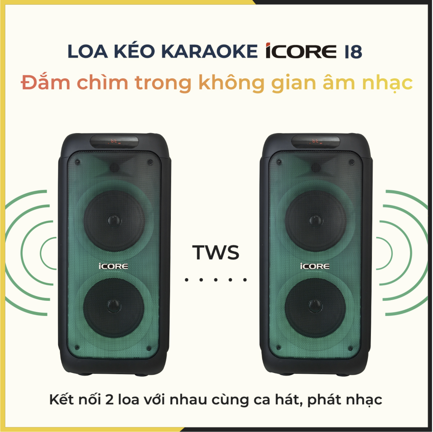 Với tính năng TWS được trang bị trên loa kéo Karaoke iCore i8, bạn có thể kết nối đồng thời 2 chiếc loa với nhau giúp mở rộng không gian nghe nhạc, Karaoke, thích hợp cho những bữa tiệc đông người, trong không gian thoáng như bãi cỏ, sân nhà. Cảm nhận không khí sôi động đắm chìm với âm thanh lan tỏa khắp nơi.